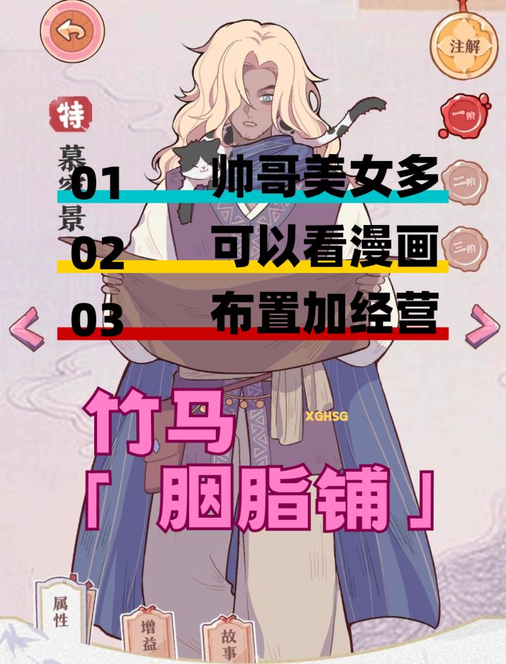 游戏定位:古风,休闲,搞笑,经营游戏的画风很精美!很可爱。玩法很多,而且不卷,可以当成休闲小游戏玩玩啦,里面可以经营店铺,研发美妆产品,还可以种田等等。喜欢收集角色的也可以收集自己喜欢的角色呀。#游戏安利#穿越古代当美妆大掌柜#竹马胭脂铺