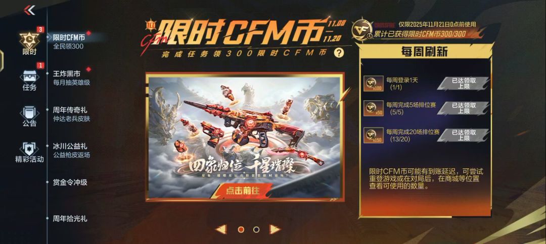 我这个号怎么没有限时武器库补偿的一万赏金令积分活动啊,我登其他号都能领,就这个号没有#穿越火线枪战王者十周年
