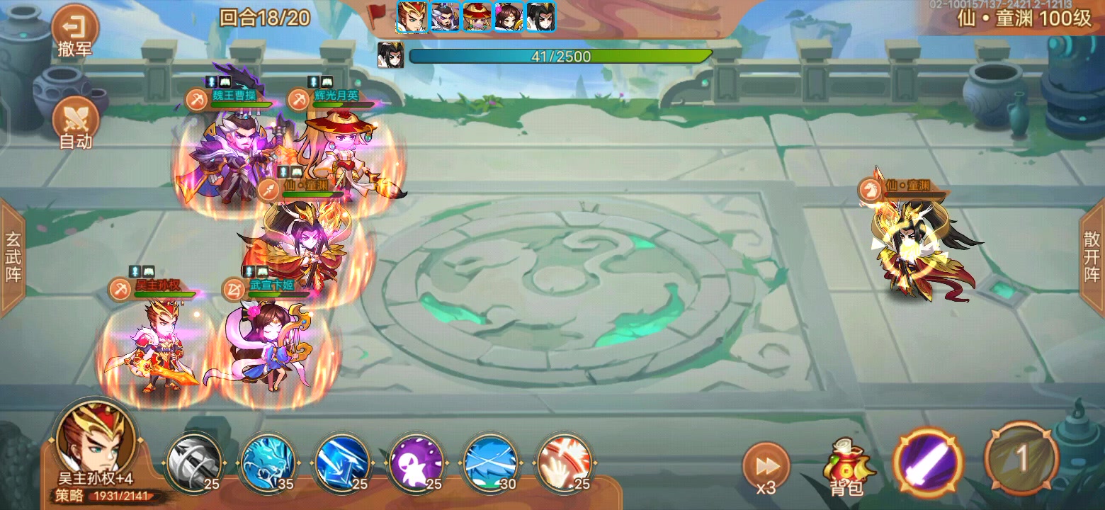 孙权五觉了,把辅助的赤兔马全部换成的卢凑血,甚至把上古头铠分给孙权凑血防,虽然平均血没到100万,但还是开着40级玄武找童渊抢神通成功,确实如二群(589913956)大佬梦神机和我大哥顾众生所说带五觉孙权有手就行! 下面视频中的装备搭配和属性仅供参考,除了四速卞姬偶尔被秒,其他都能站住,孙权上古头铠11万防御的90万血就足够站住了。 策略必带:洗髓,复活,弩炮,清策 一速孙权直接开大,因为