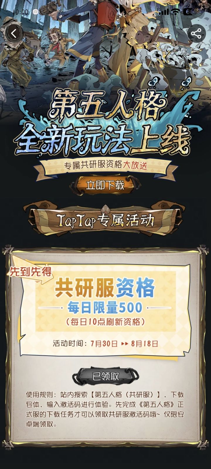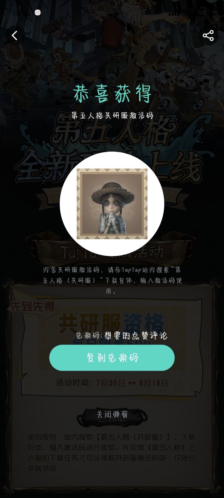 申请共研服激活码(第五人格)