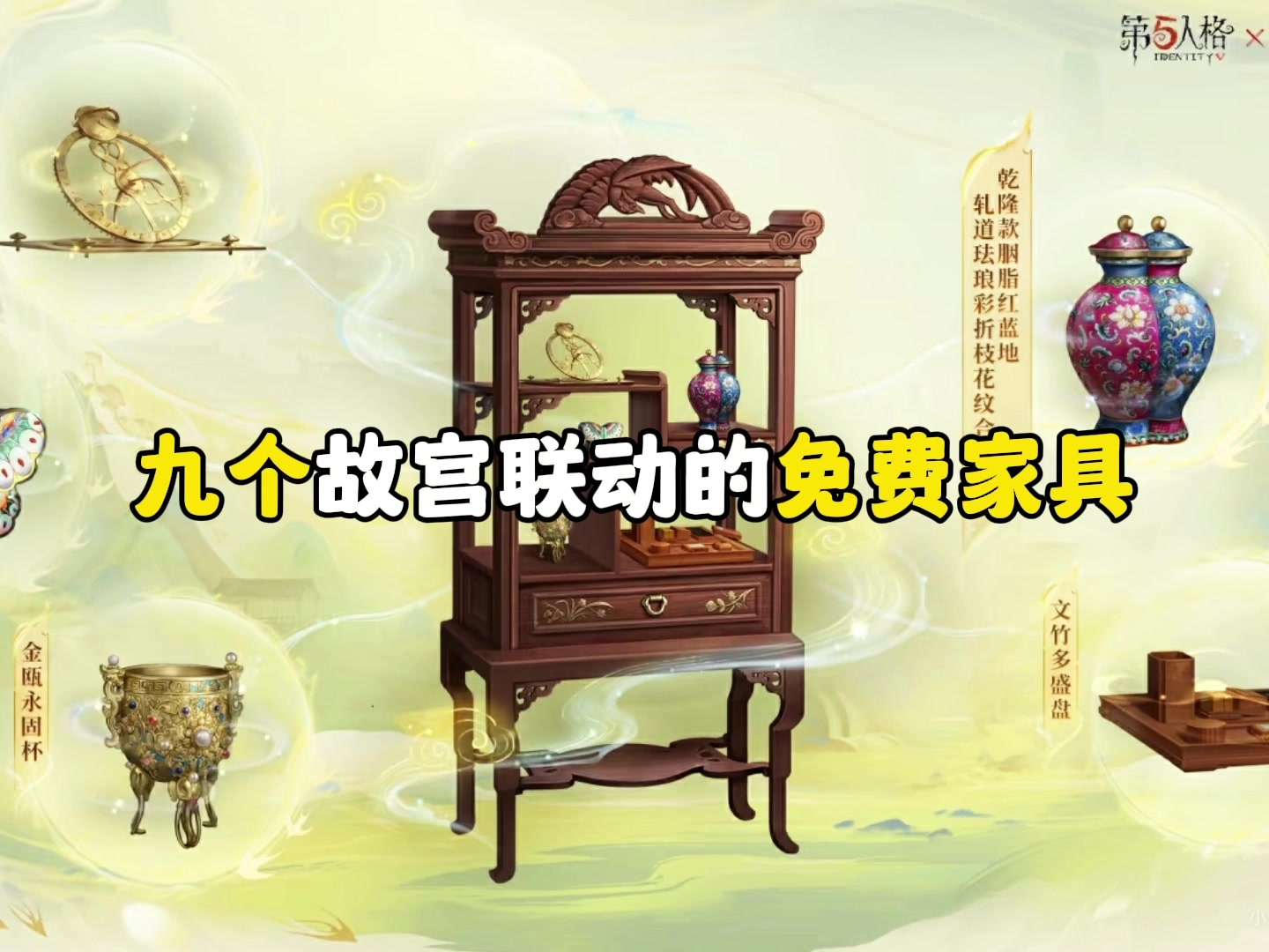 *通过活动剧情探索,可免费获得奇珍家具-藏品展示柜及5种藏品:金瓯永固杯、画珐琅蝴蝶纹蝴蝶式盒、铜镀金赤道式日晷、乾隆款胭脂红蓝地轧道珐琅彩折枝花纹合欢瓶、文竹多盛盘; *通过对局或剧情探索可在【活动商店】免费兑换活动奖励奇珍家具-紫檀木边座嵌珐琅五伦图屏风,获取上限增加至2个; *参与限时公共地图活动,可在地图商店处免费兑换独特家具-简易展示柜(上限5个)和独特家具-各种釉彩大瓶(上限2个)。#第五人格
