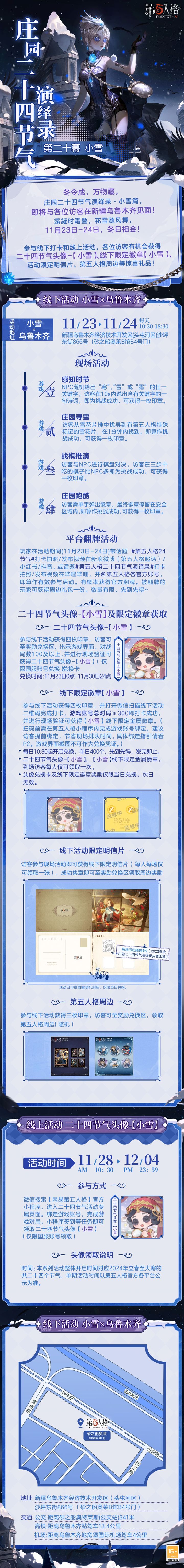 #第五人格 #第五人格24节气 深冬将至,花雪随风,寒意渐浓, 欧利蒂丝庄园二十四节气演绎录·小雪篇, 在这个冬天与访客们相约新疆乌鲁木齐。 11月23日-24日,期待相会! 天气越来越冷,请参与活动的访客注意保暖哦~ —————————— 【线下活动】小雪·乌鲁木齐 活动时间:11月23日-24日 每日10:30-18:30 活动地点:新疆乌鲁木齐经济技术开发区(头