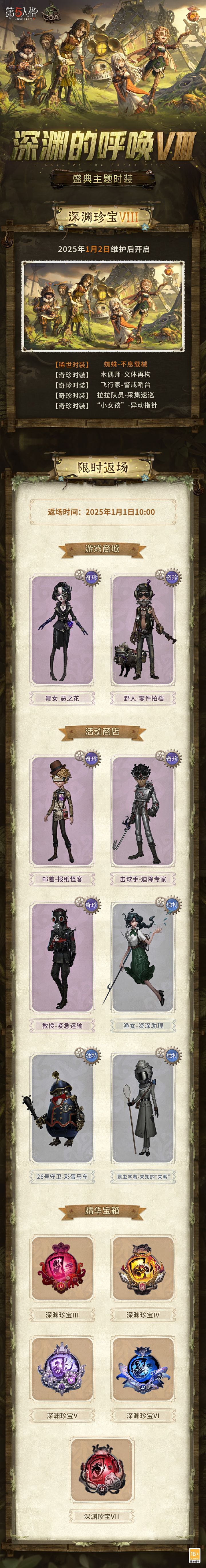 荒原探索仍在继续,记忆回涌,源头的真相即将揭开—— 【深渊珍宝VIII】稀世时装及奇珍时装的游戏内效果展示视频爆料来啦,2025年1月2日维护更新后正式开放! *使用蜘蛛-不息载械时,可透明化背部旗杆与风翼,减少对自身的视野遮挡 #第五人格COA8 #第五人格