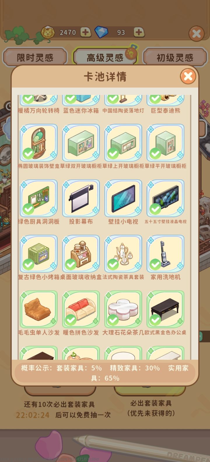这个我真的服了,用了五十多个刷新券没有刷出来,然后看广告也没有,去家具里边看突然发现压根没有这个家具,但是我从其他小伙伴里边看到是有这个的,这是算什么?而且看其他小伙伴这个关卡很多家具都刷不出来,那我请问不能设置好概率吗?嗷呜商城每天的都是那几样,那有啥用啊,还不如关了,希望官方解决一下这种问题真的很败好感,谁懂啊!!!一个关卡卡了四五天不是因为没钱没树叶没钻石,而是因为