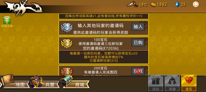 邀请码:EF2046 诚信互填过四图 先说一下心得吧,一开始听大佬的话把团长拉满了,然后1w8招杂兵平推,确实打得很快,后面没忍住氪了两笔拿了俩传说英雄雷神水神,都点了财富,准备后续走电弓队,不过我发现先拉满级别也有一点不太好,就是前期不能刷钻,级别比地图高太多爆率就会很低,而且钻石后面是真难攒呀,期间还不小心给电法买了个一百钻的武器,也没个提示不小心点到就装备上了#策略军团刷