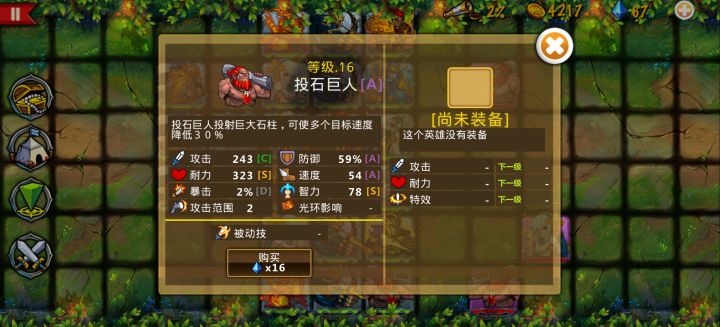 这些英雄很强力,这个阵容也很不错--来自玩家E6979#策略军团精彩分享 关卡1-16同时有这3个好用的英雄,在这一关卡刷英雄效率更高喔。投石巨人要是是个远攻特性配合减速就太好了,推荐远攻特性,太好用了。黑魔法师可以和任意元素精灵配合,效率更高。#策略军团每日打卡任务发帖地址1 #策略军团每日精彩分享