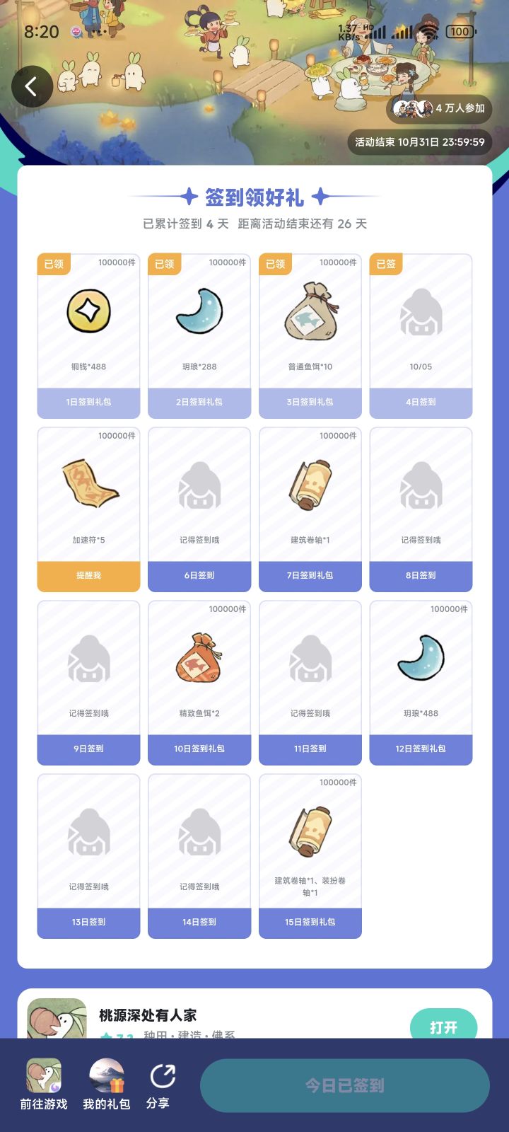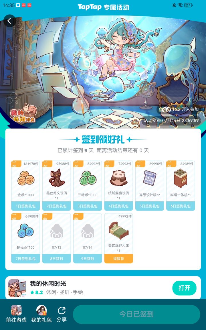 昨天周一 今天周一 明天还是周一原来周一真的可以有三天~emo  ̄へ ̄不难过了不难过了!给仙友们搞点正经的福利活动开心开心叭(*^▽^*)十月好事正酿,祝仙友如愿以偿!活动所有TapTap玩家都可以参与哦!💜活动时间💜即日起至10月16日💜活动内容💜在活动时间内进行签到,签到天数对应奖励(签到第一天领取第一天的奖励,签到第二天领取第二天的奖励,以此类推)签到隔天找客服登记发放奖励!