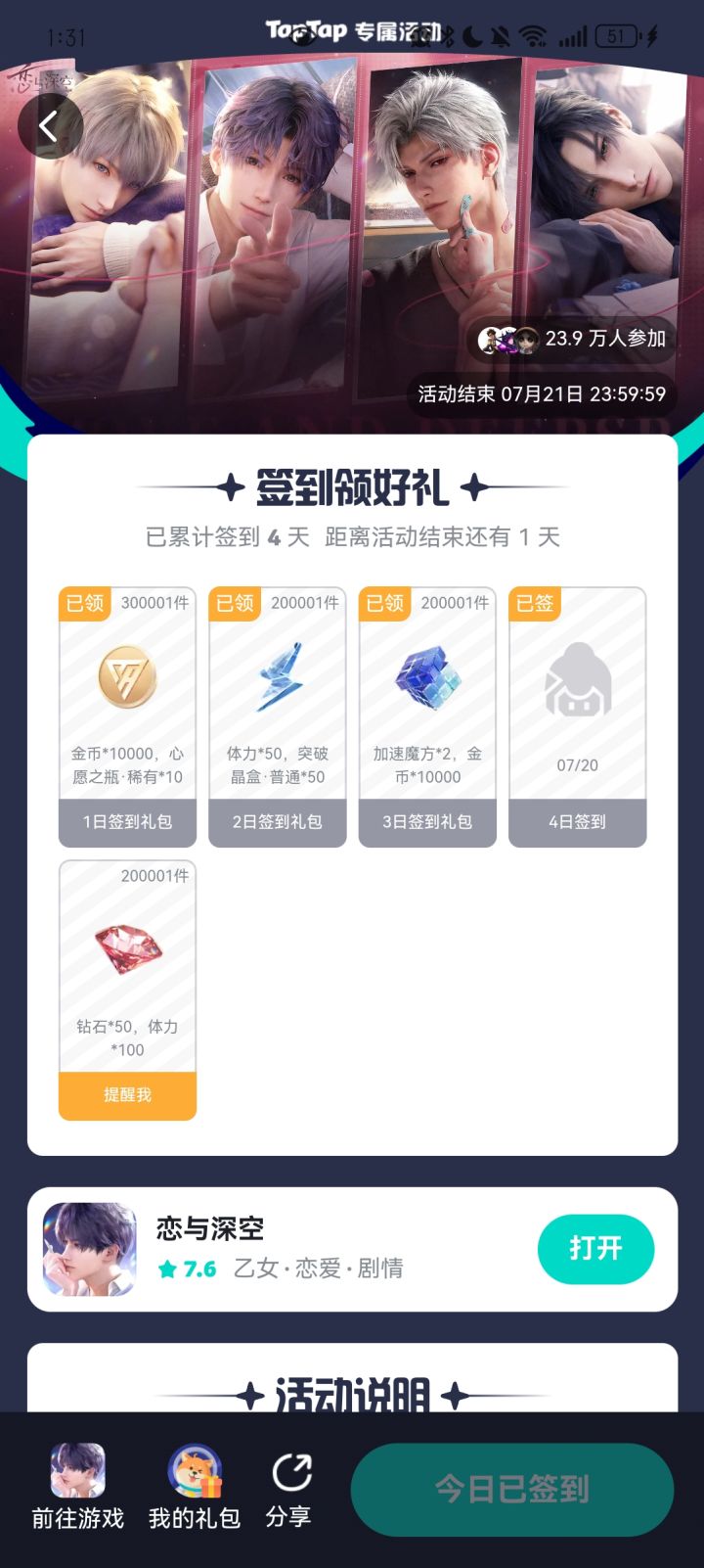 啥意思啊,今天第四日显示已签但是没有给我兑换码呀,在哪呢?还是说今天是没东西的?#恋与深空签到福利 #签到兑换码 #恋与深空更新版本 #恋与深空