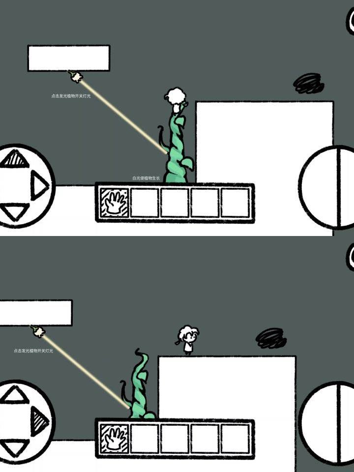 #光照谜林 有信息⏩⏩⏩ 这是一款简笔画风的休闲解谜游戏。主要玩法是✨🔦利用光照促进植物生长、使用各种道具(如可以把光刷成绿色的刷子)改变光的效果,解谜闯关。—————————————————— 🌲游戏中,光可以让植物生长。一开始你只需要用光照射(需要手动点击一下花花)藤蔓,让它为你搭建藤蔓桥到达对岸。🌲后来,你遇到了能改变光的颜色的刷子,使用绿色刷子把光刷成绿色射线,能够让植物产生