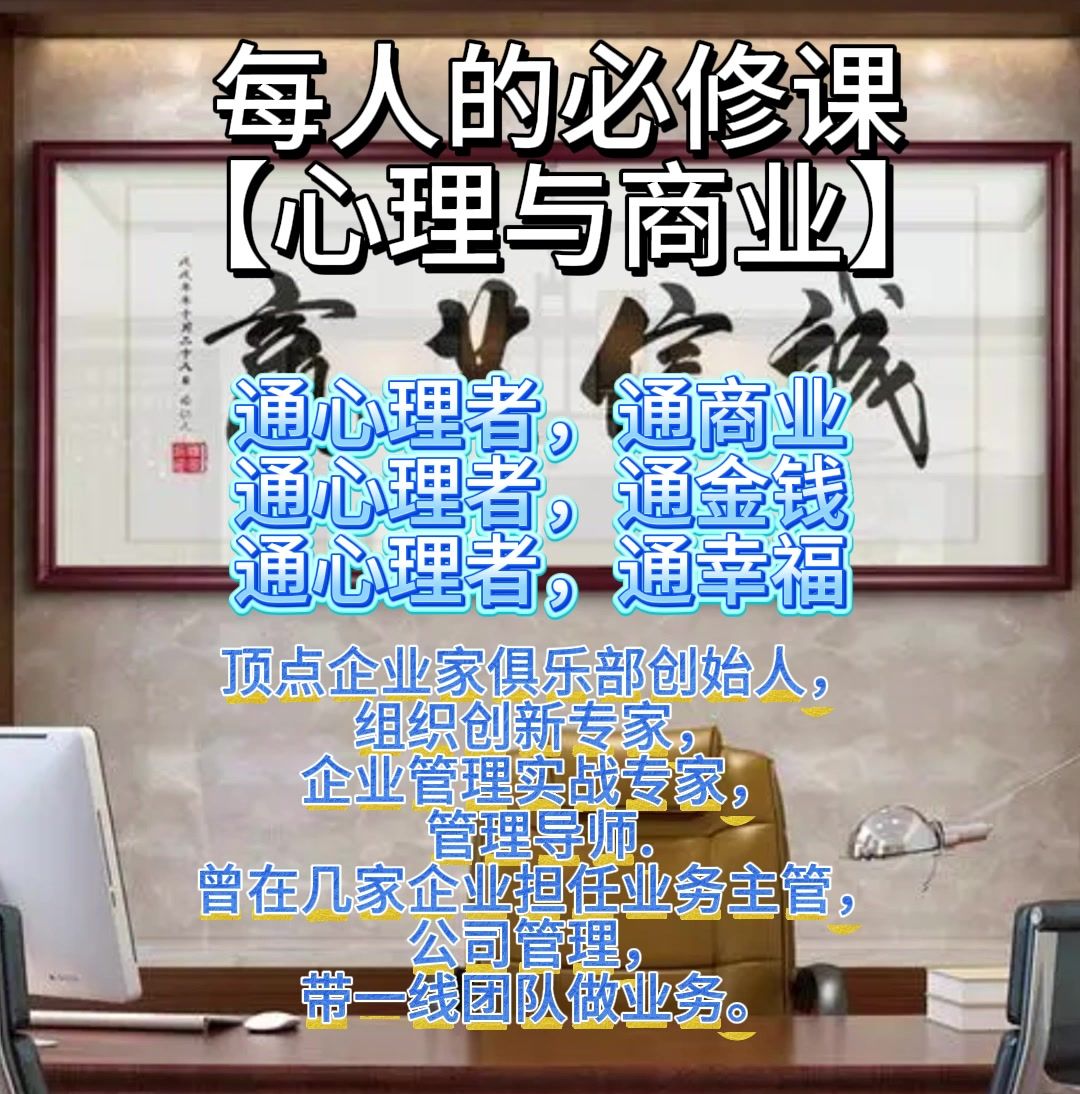 每人的必修课【心理与商业】 通心理者,通商业 通心理者,通金钱 通心理者,通幸福 顶点企业家俱乐部创始人,组织创新专家,企业管理实战专家,管理导师. 曾在几家企业担任业务主管,公司管理,带一线团队做业务。 你将学到 如何让员工听话照做? 如何让客户主动购买? 如何防小人吸引贵人? 如何不被坑保护自己? 如何处理好人际关系? 如何破圈层改变命运? 课程大纲 解码心理,逆袭人生 1、如果不了解心理,你
