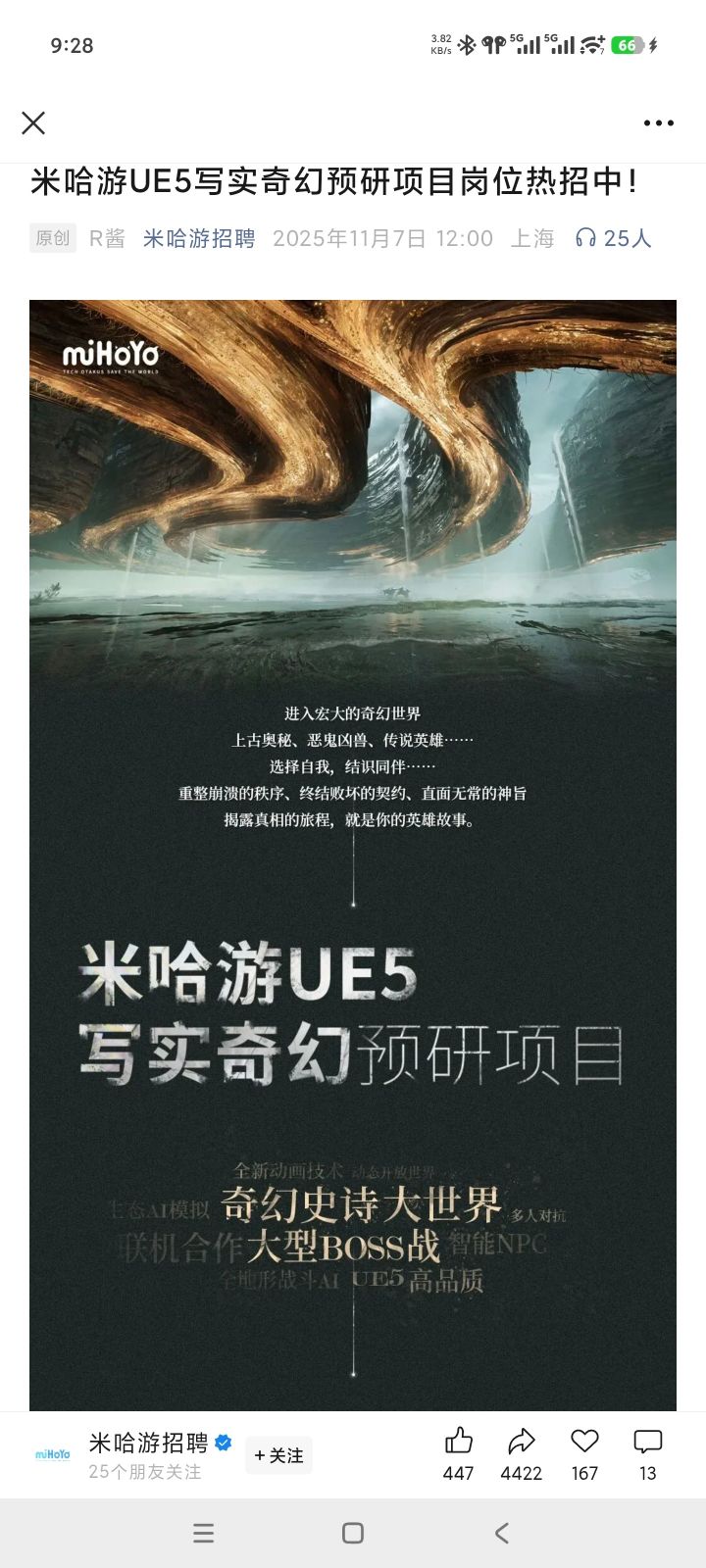 看到米哈游要做“UE5写实奇幻开放世界”!这次技术宅再次挑战世界,那个靠着《原神》《星穹铁道》吃遍天下的二次元巨头,居然真的要跳出舒适圈,去做一款“写实奇幻史诗”?米哈游最近放出了一波超大规模招聘,整整63个岗位,从战斗策划到分镜导演全线开招,背后正是一个基于虚幻5引擎的“奇幻史诗大世界”项目。关键词是大BOSS战、多人生存对抗、开放世界、AI生态模拟。但震撼的不只是玩法,而是这家公司这次真的