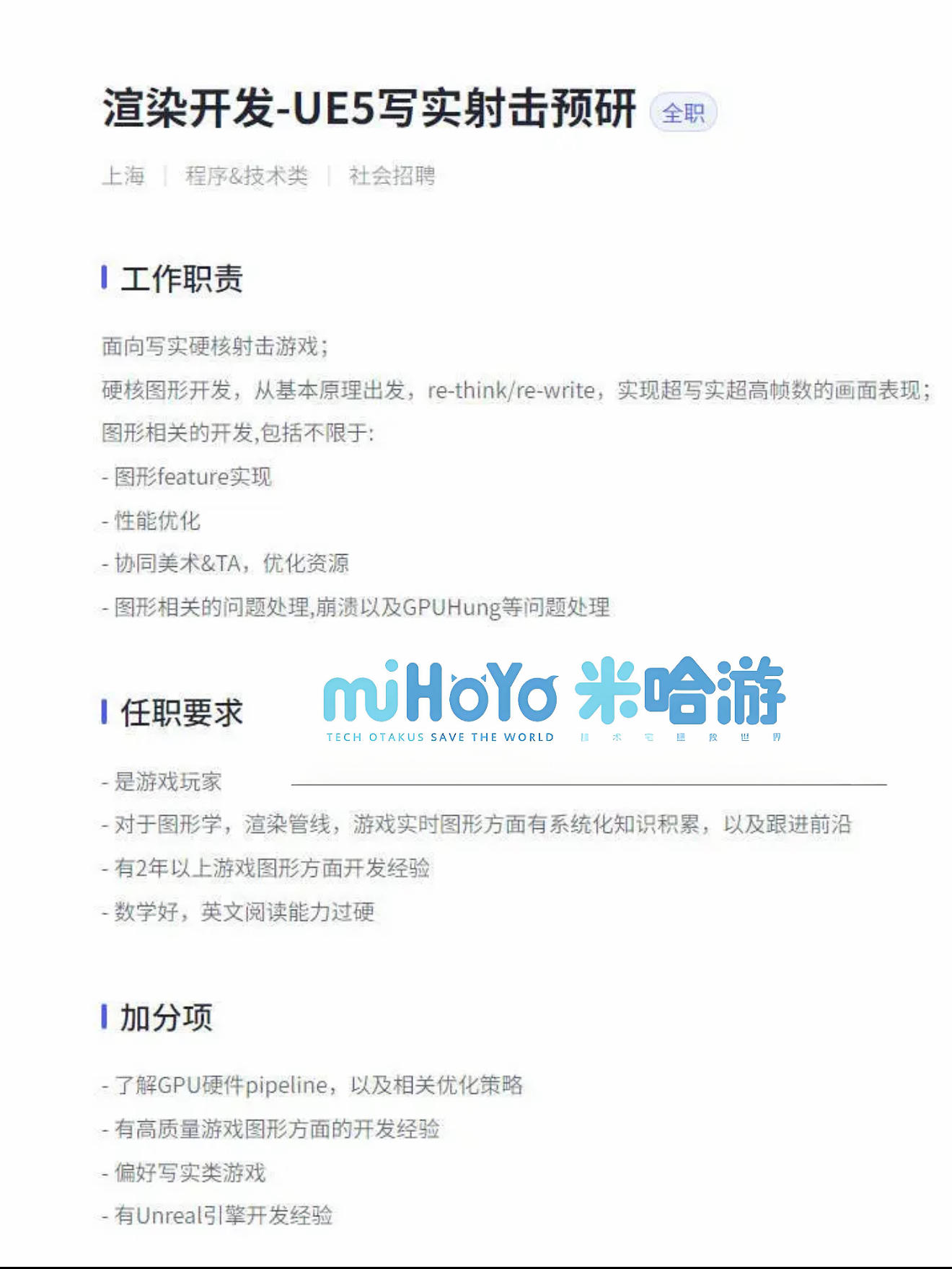 米哈游进军FPS赛道?UE5写实射击新游曝光,招募多领域核心人才