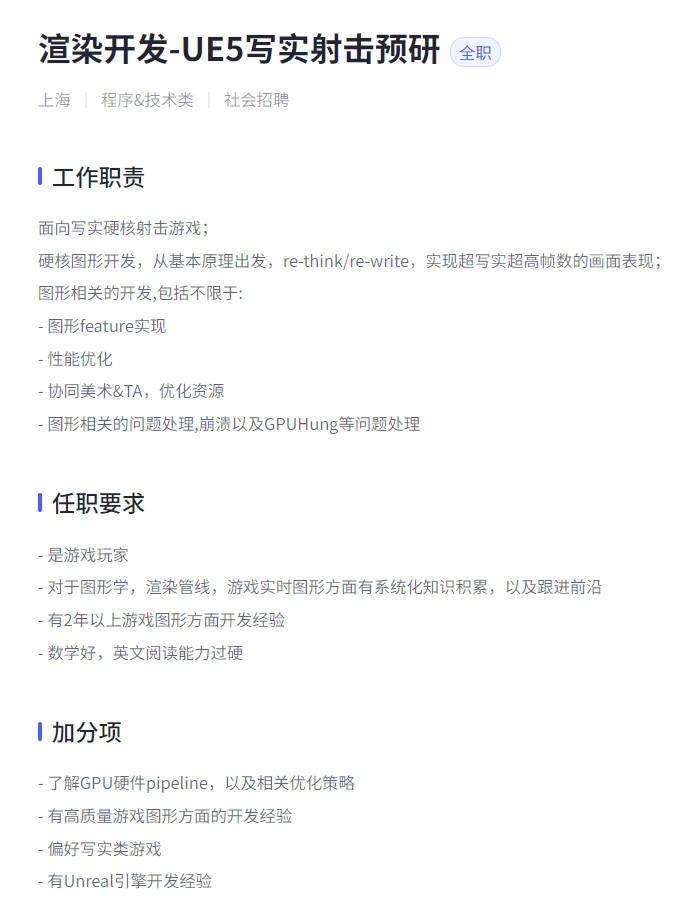 米哈游虚幻5写实射击招聘,硬核赛道迎劲敌