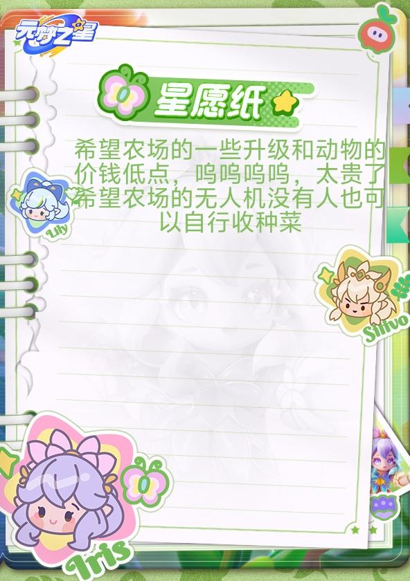 奇幻旅程再次开启,“星愿池”福利必不能少!!!本期愿望究竟是“增加XX家具装饰我的农场小屋?”还是“新增XX道具?” 不论是什么,只要在信纸上写下愿望,带话题 #精灵之森许愿池 发送,就有概率会成真哦~在星愿池中许愿更有机会获得随机掉落的惊喜奖励哦~活动时间:2024年9月2日至2024年10月9日23:59参与方式:活动期间,星宝们可以将愿望写在信纸上,在TapTap论坛的【星愿池】