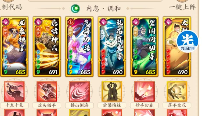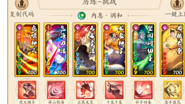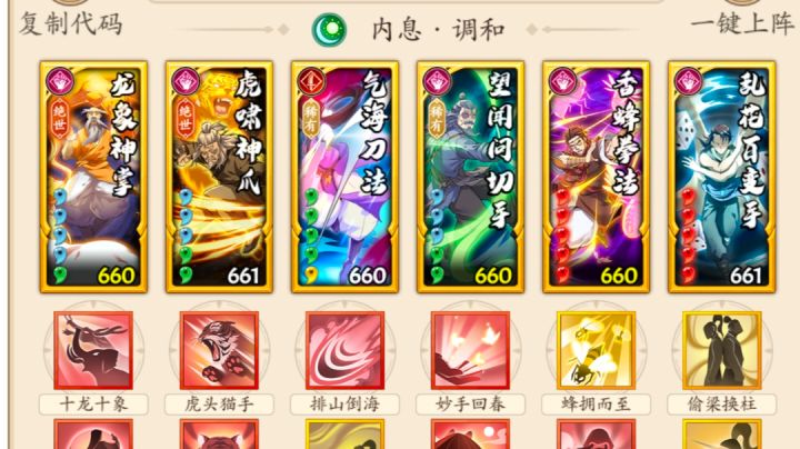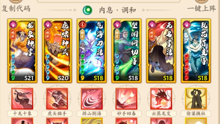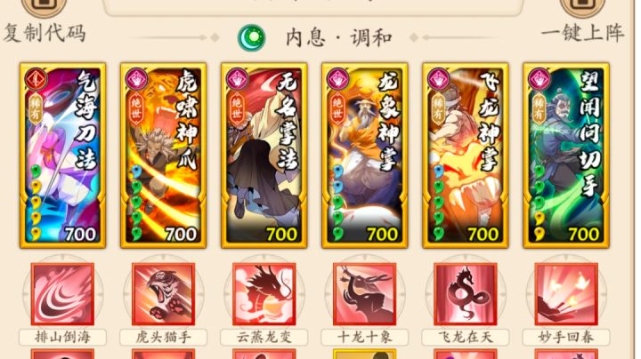 无名掌法和新招式就不过多介绍了,详细可以看我宗门大师姐苏苏的攻略 不过这个新招式对于后手调和拳来说我个人是觉得不如一个减伤或者控制来的实在,所以我下面的搭配没有上这个招式(实际上是没有开出来) 想上这个招式的话,可以自行控制在无名拳后面触发,吃暴击回血,下面是一些常用搭配 一 五号位无名拳 这套放弃破胆,但可以吃满回血和暴击,太祖双出手爆发加三后手爆发,这里太祖可换无相 c