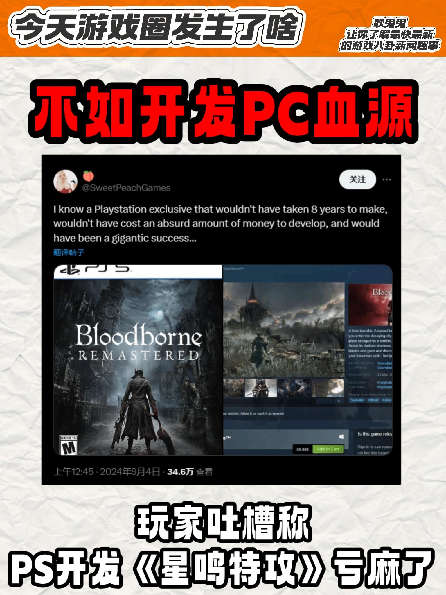 索尼PlayStation旗下射击新作《星鸣特攻》将在2024年9月6日停服下线,于是就让玩家想起来了那个游戏,对就是血源,然后遭玩家发文吐槽不如开发PC血源(确实个人觉得好刚就要用在刀刃上不是嘛)大家怎么看索尼这一波。#steam游戏 #steam #今天游戏圈发生了啥 #吃瓜杂谈 #索尼