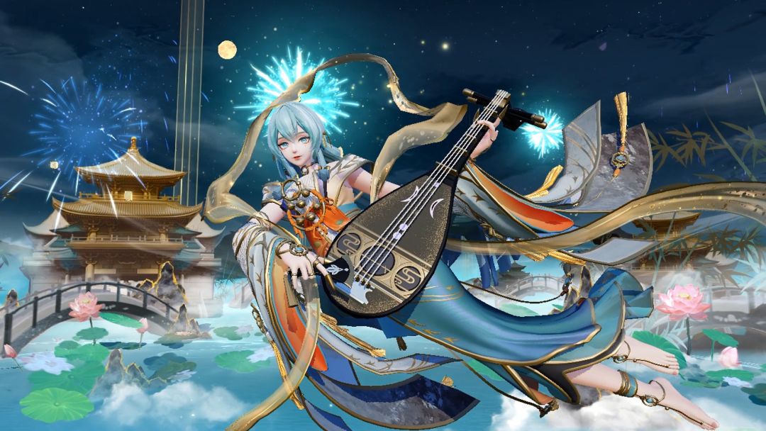 新妆初成,粉黛微盈暗香, 眸凝秋水,素手且试朱弦。 待一曲终罢,余韵连绵未绝, 闻者人人自醉,散尽浮生之忧。 9月15日维护后,紧那罗全新应援大赛优胜皮肤「晚音拂月」将正式上架服装铺,售价106皮肤券,首周更有7折优惠,请勿错过哦! ▷特效设计思路 紧那罗精通声乐,能够使用五种乐器弹奏出不同的韵律。当悠扬弦歌响起,璀璨华光便会随旋律悄然流转,与身上的织锦飘带合奏共舞,令乐音更显曼妙。 ▷聊赠晚音 9