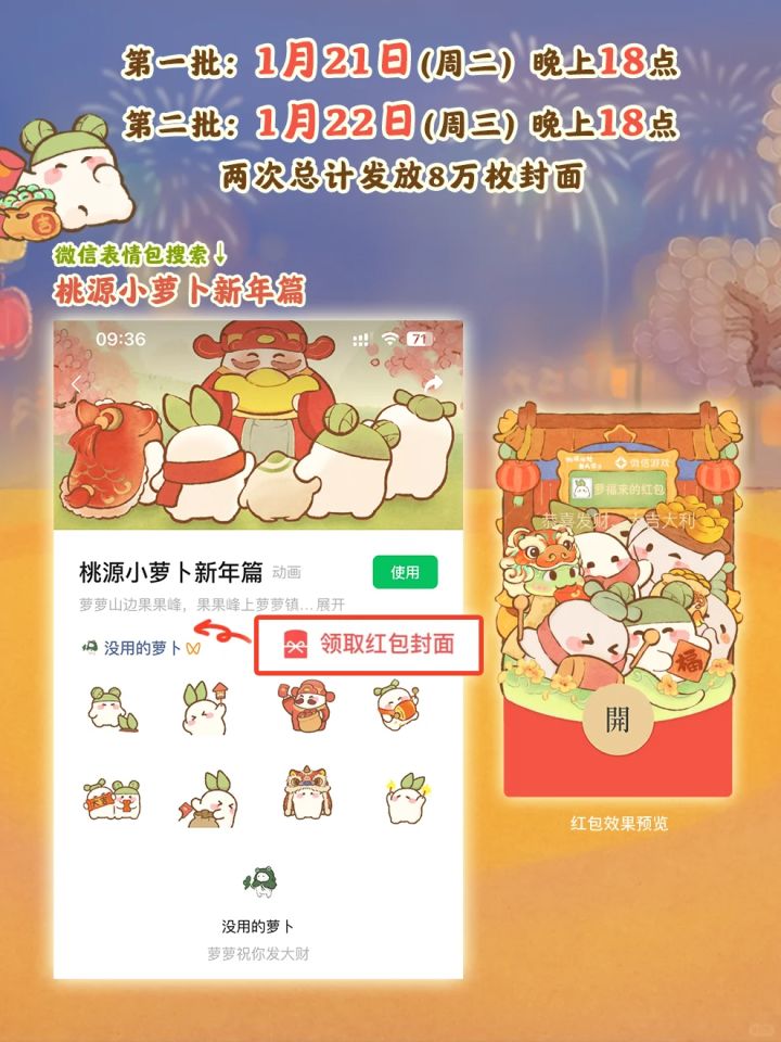 目前共两种渠道第一种渠道:在绿泡泡表情页搜索: 桃源小萝卜新年篇进入表情专辑页领取!(“领取红包封面” 字段只在开始发放点后显示)领取时间:1月21日18:00 和1月22日18:00第二种渠道:红包封面将在《桃源深处有人家》的各大官方账号及社区陆续掉落领取时间:1月22日12:00和1月23日12:00#桃源深处有人家 #红包封面
