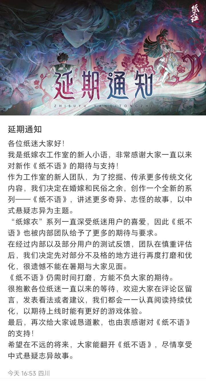 中式奇谭悬疑恐怖解密游戏《纸不语》因质量和里面的设计内容做的不太满意内容较差而导致重新打磨,最早也于10月1号之前上线,因为毕竟是重新制作,所以恐怕要等一个月的时间了,预计10月3号左右上线一切看官方的吧,上不了咯开学了大家也要好好学习 好好工作,好好上班,没时间玩 那就努力一下吧开心健康最重要!#纸不语 #纸不语合集 #纸不语官方