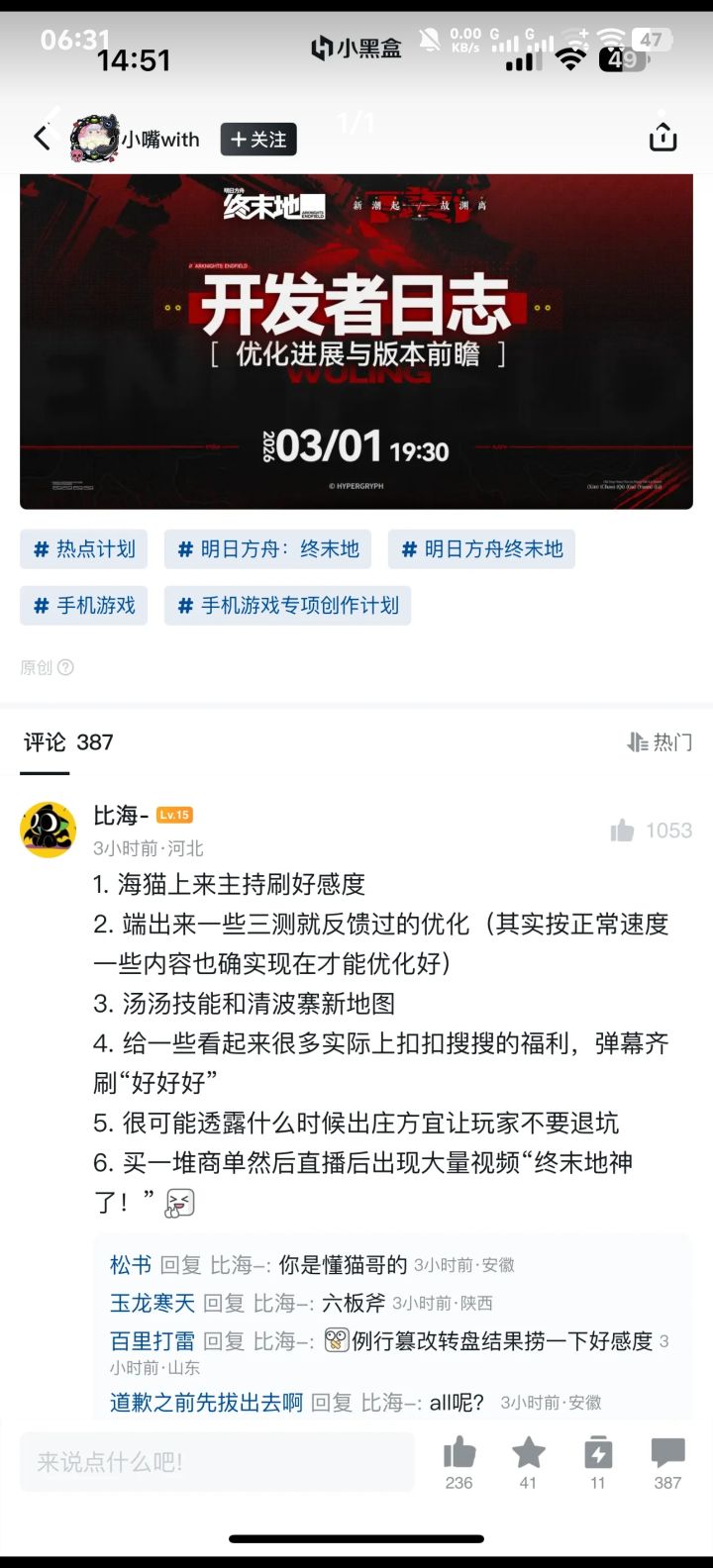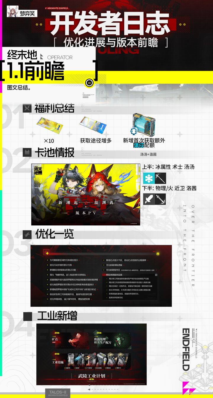 管理员,本次 《明日方舟:终末地》开发者日志情报整理完毕,请您查收。▼//资源获取与干员养成优化▼//交互与易用性优化▼//战斗体验优化▼//集成工业系统优化▼//新干员前瞻▼//地图与玩法前瞻▼//武陵工业计划更新▼//版本活动前瞻▼//未来版本前瞻