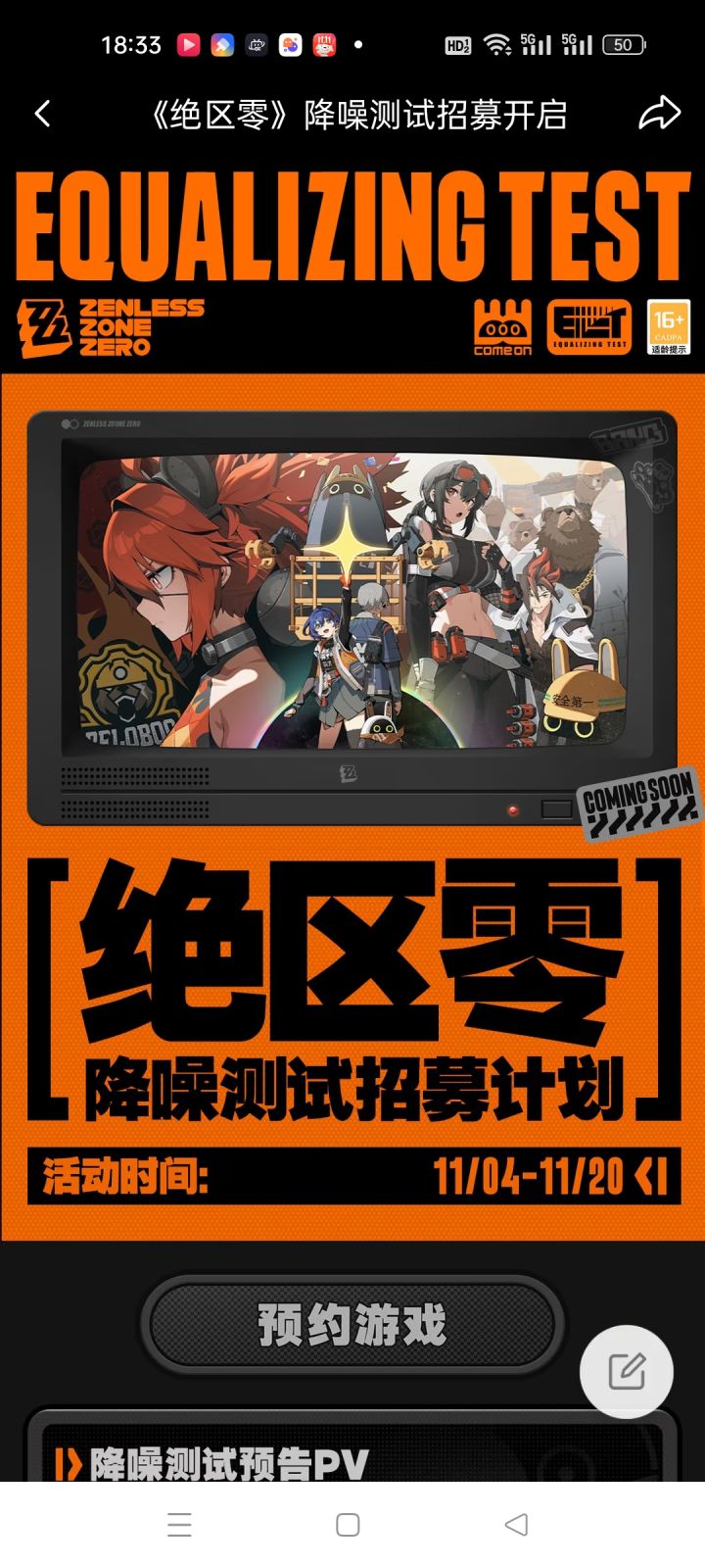 还还没抽到资格的,还没预约的,快快快点击下方链接预约抽奖吧!米哈游全新动作游戏《绝区零》「降噪测试」现已开启招募!前往参与活动,有机会获得测试资格、实物周边等奖励!https://zzz.mihoyo.com/?shareCode=N19O71JMXN#绝区零#绝区零二测资格#绝区零测试#绝区零二测#攻略