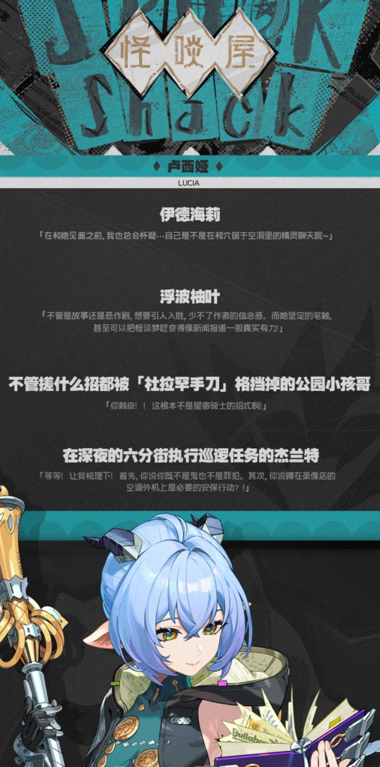 「真希望所有的故事都没有结局,那样我就有了不停翻页的勇气。」伊德海莉 「故事是作者对事实进行的浪漫侵蚀。」「无论是言之凿凿还是天方夜谭,和真实的距离并不影响故事的好坏。」「违和的水位总会随情节的展开退去,请放心地进入我的叙事吧~」 中文CV——张晔日文CV——原由实
