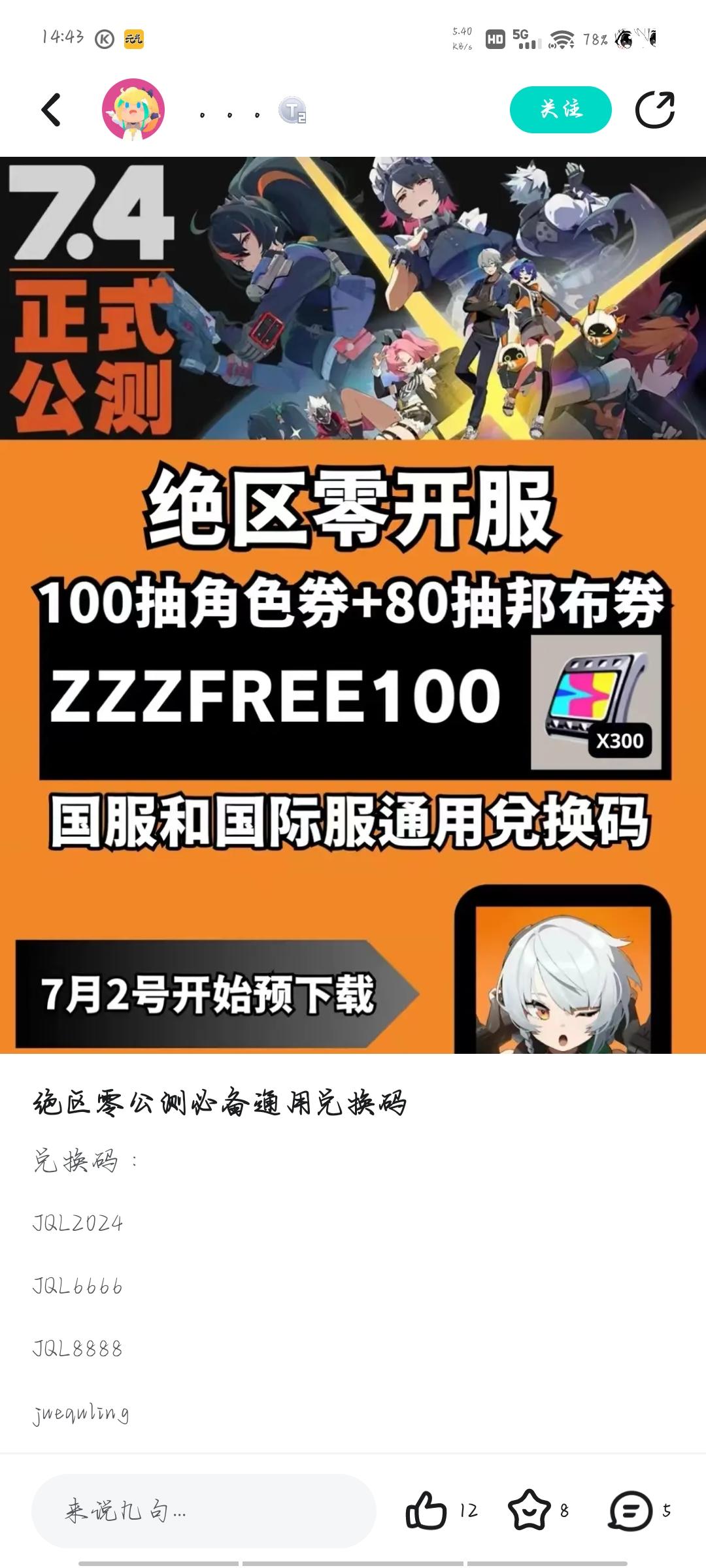 🌠游戏名称🔸《绝区零》🌠关键词🔸动作|米哈游|二次元|科幻都市风————💖公测兑换码🔸ZZZFREE100💘超多福利ing《绝区零》公测登录即送30抽,体验游戏相关活动,最高累计可领100抽角色券、80抽邦布券,还可获得A级代理人等游戏奖励。💫科幻都市风 超级喜欢❗❗🐾还有福瑞💥宝子们,点个赞赞,关注欧尼酱,本帖持续更新官方兑换码💕#游戏种草计划 #绝区零 #吃瓜爆料 #二次元#帅哥