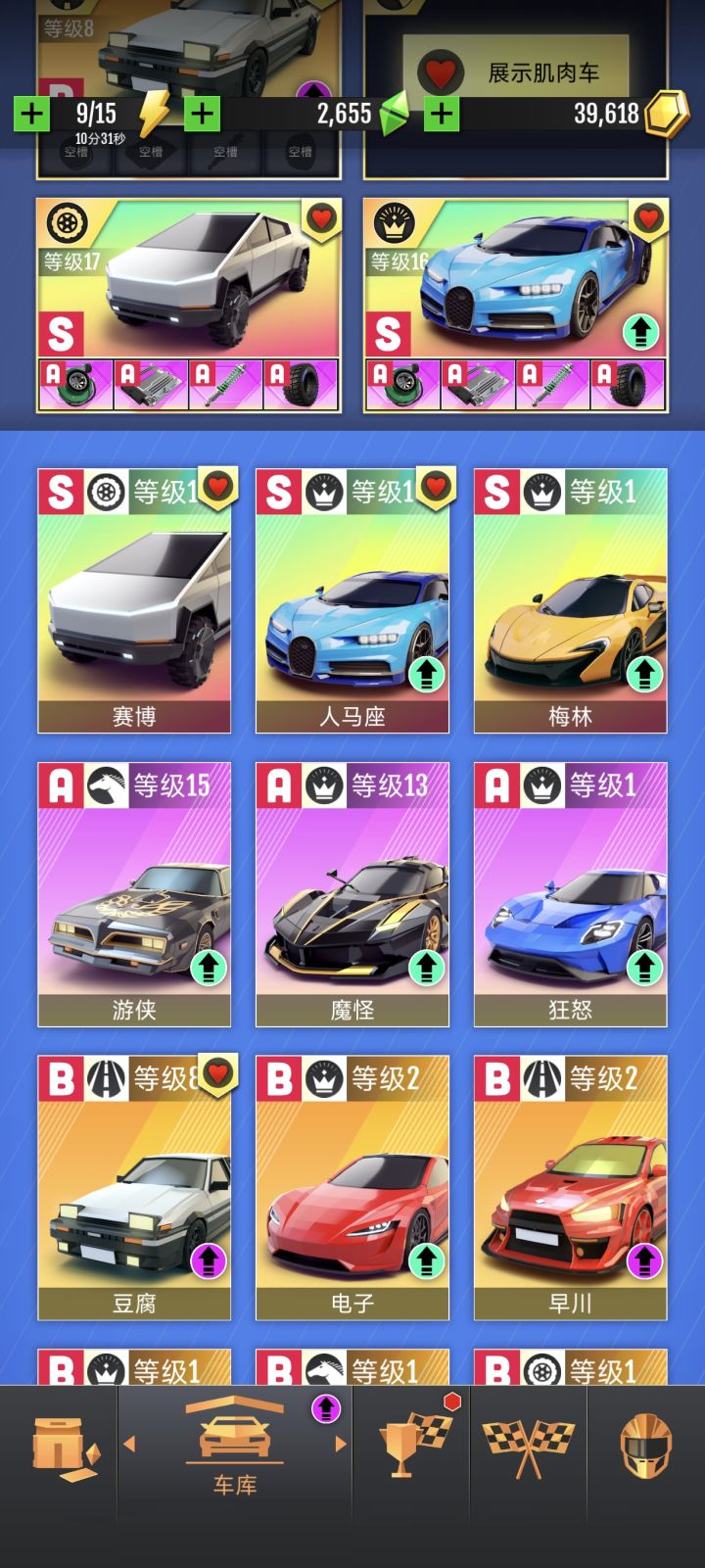 车库里超跑,越野,肌肉都还行,就是改装太拉了,跑多弯道只能用人马座硬吃(梅林是后边出的,没资源养),现在改装车的资源已经很多了,都还没用,豆腐还只是B车,是攒着资源等着下一个改装卡池,还是升级豆腐这种B车(感觉挺浪费的,只是微克玩家),这游戏不能重置车辆是真难受……顺便加一波好友https://hotslidegame.tapcheer.cn/?friend=xVW+1zgs5nMPV/NHE