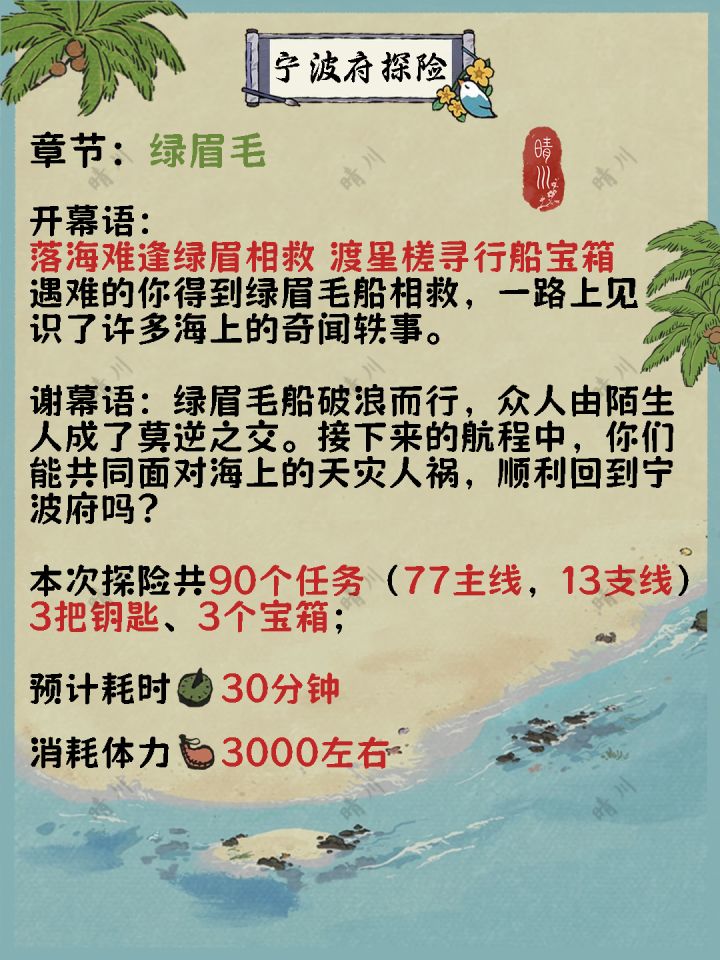 章节:破浪记·绿眉毛开幕语:落海难逢绿眉相救 渡星槎寻行船宝箱遇难的你得到绿眉毛船相救,一路上见识了许多海上的奇闻轶事。谢幕语:绿眉毛船破浪而行,众人由陌生人成了莫逆之交。接下来的航程中,你们能共同面对海上的天灾人祸,顺利回到宁波府吗?本次探险共90个任务(77主线,13支线)3把钥匙、3个宝箱、3个彩蛋;预计耗时 30分钟消耗体力 3000左右本次探险包含大量