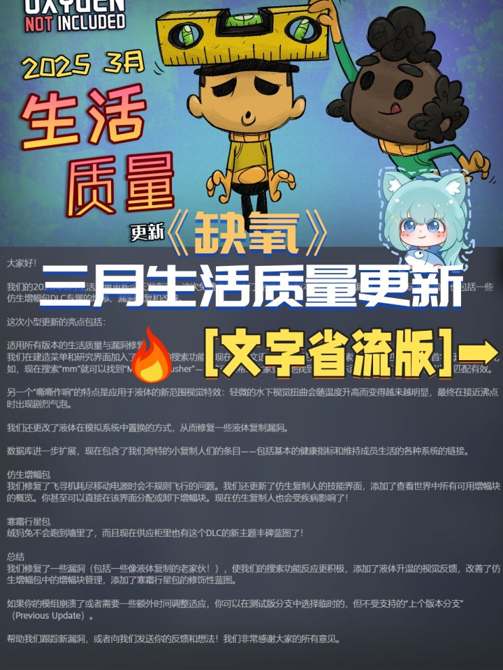 2025.3.14新鲜上线的三月生活质量更新✨必看重点优化✨🔍【智能搜索】建造/研究界面新增关键词搜索!英文可以使用模糊搜索、同义词匹配,甚至缩写(中文目前只有同词语匹配有效)💧【视觉特效】液体温度变化沸腾前会咕噜咕噜冒气泡😷【仿生人也会生病】还更新了仿生复制人的技能界面------🆕还修复了一些漏洞,添加了寒霜行星包的修饰行蓝图等~#今天游戏圈发生了啥 #缺氧