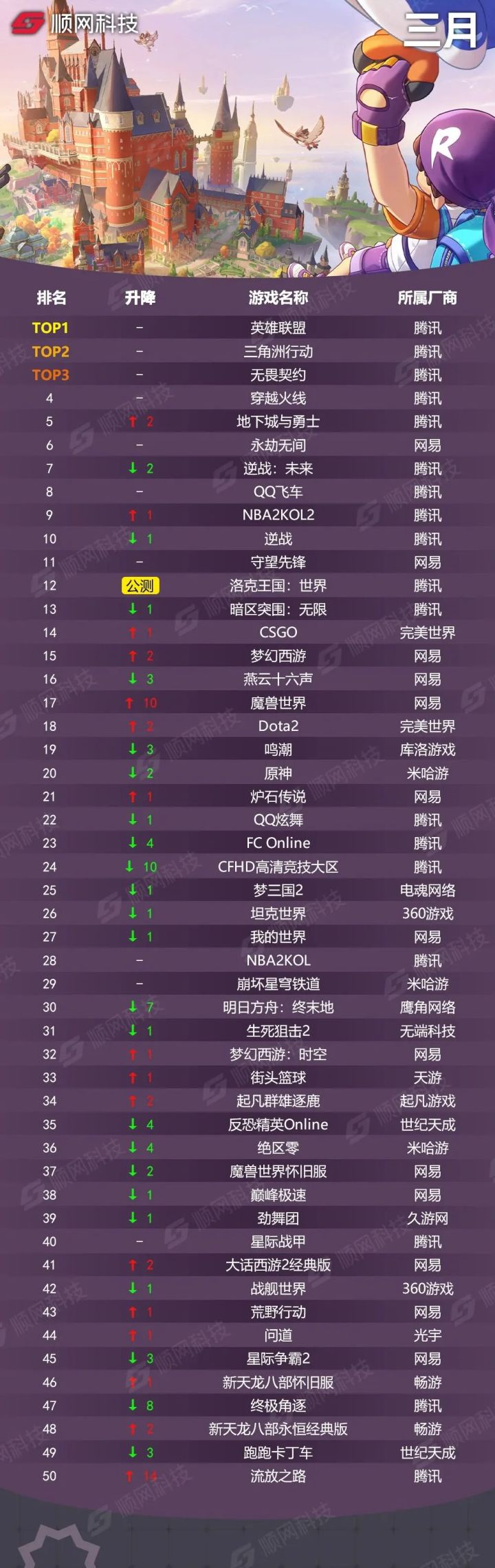 顺网科技近日发布2026年3月网吧游戏热力榜TOP50,数据显示国内网吧市场格局整体稳定,腾讯系游戏依旧占据统治地位,新游《洛克王国:世界》与经典 IP《魔兽世界》表现格外亮眼。头部梯队竞争激烈,腾讯游戏强势包揽前五:《英雄联盟》《三角洲行动》《无畏契约》稳居前三,《穿越火线》与上升两位的《地下城与勇士》紧随其后。TOP10榜单中,仅网易《永劫无间》位列第六,其余九席均被腾讯拿下,展现出极强的市
