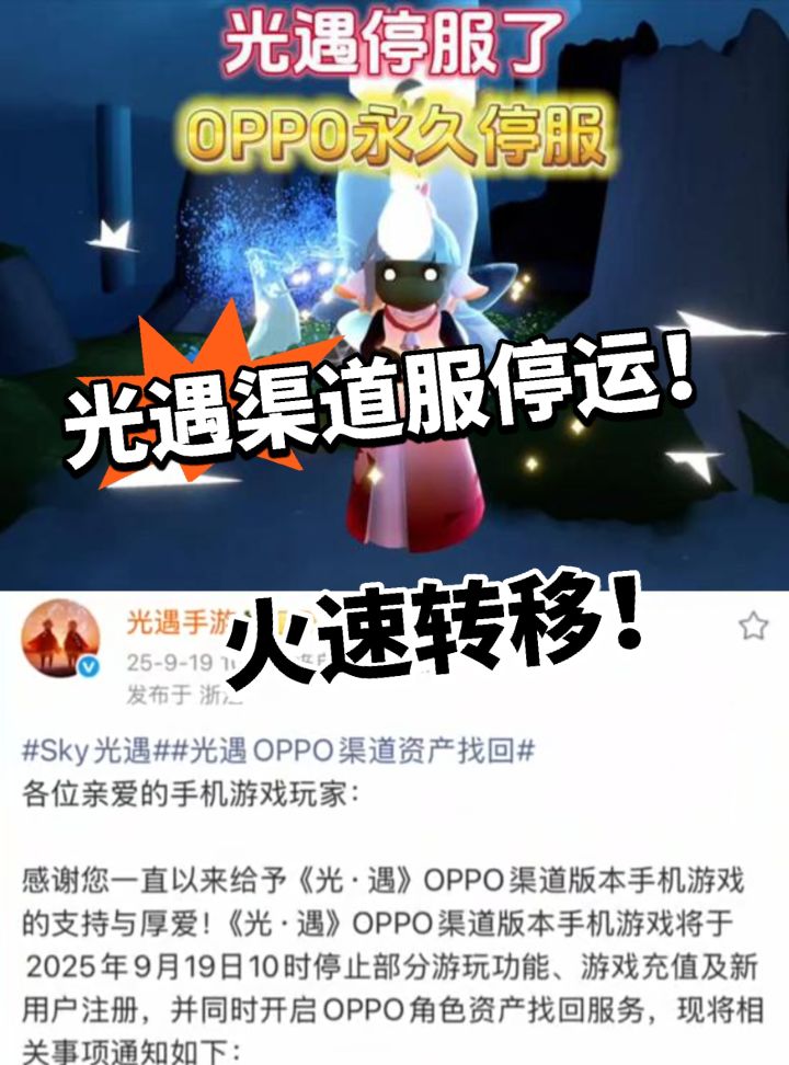 玩光遇OPPO渠道的宝子注意啦 近日光遇正式官宣 OPPO渠道服即将停止运营。从9月19日上午10点开始,就不能再安装、充值,也没法注册新账号了 。 不过现在账号里的道具这些东西还能继续用,游戏也能正常玩到11月19日上午11点,这个渠道就彻底不能登录了 停服是因为游戏方和渠道的合作调整了。 不过官方也为大家进行考虑,毕竟游戏玩这么久突然被删除账号会很难受。官方也是开通了转移服务。打开