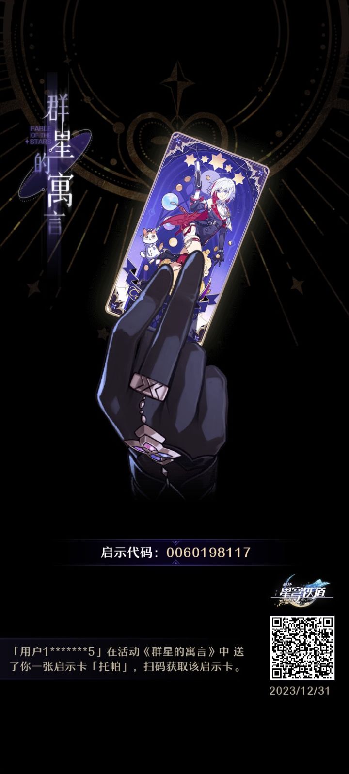 求一张托帕和花火,其他牌都有多余的,如果换到了我要的我会在评论说明,剩下多余的牌可以送给你们!!#崩坏:星穹铁道#崩坏星穹铁道#群星的寓言