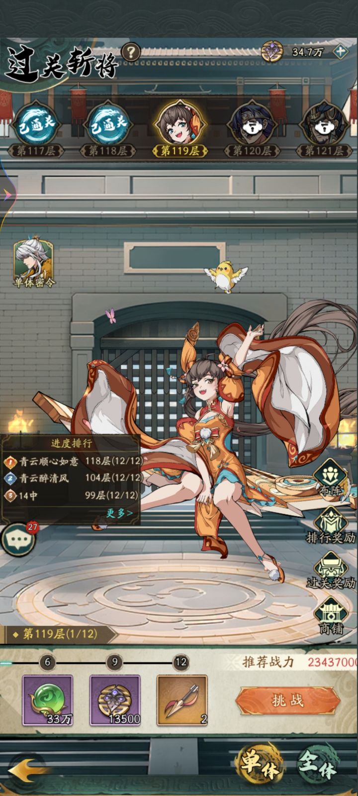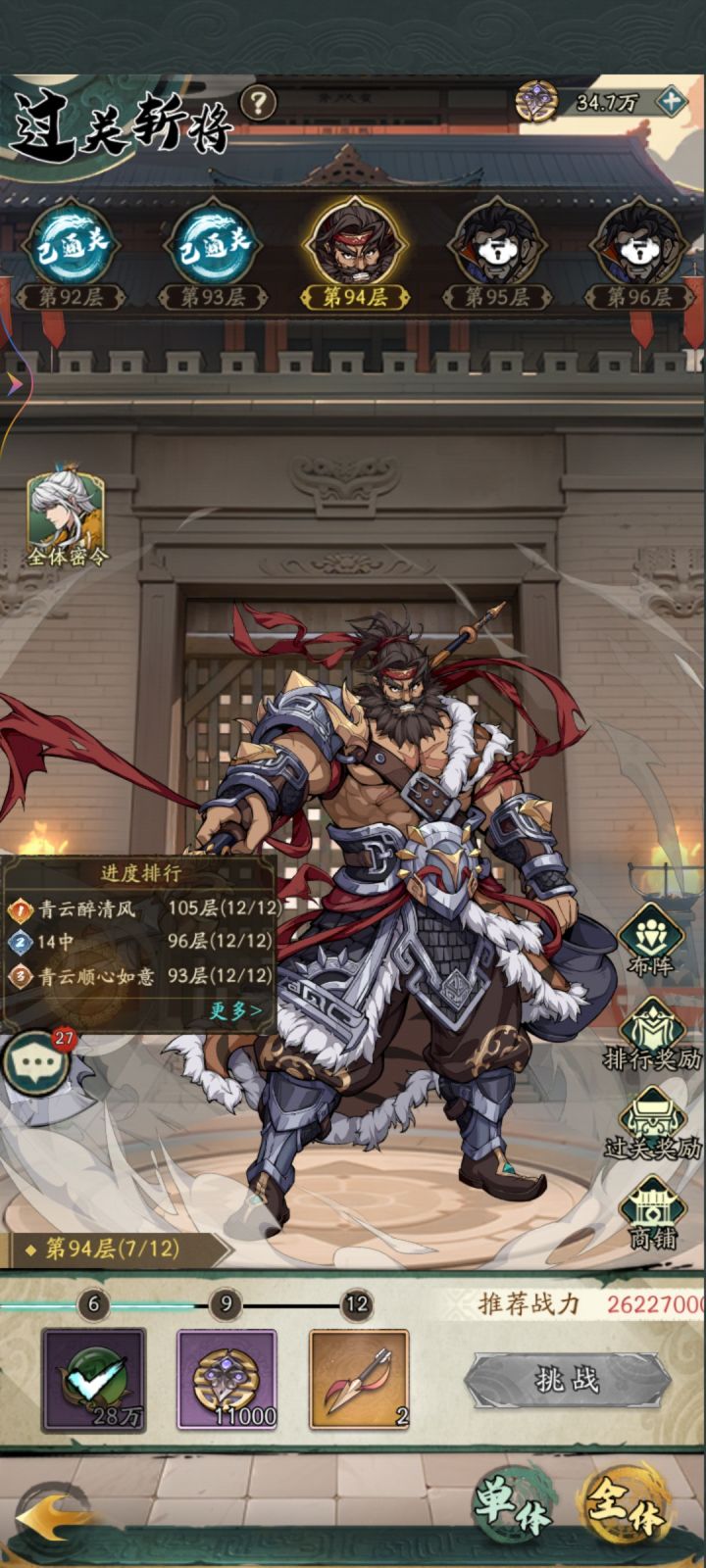 第二天开始忙起来了,限时斩将开起来,我们这个区的人挺活跃的,氪佬挺多,无论是爬塔还是全体斩将都需要借将,把氪佬的主c都借一借,每天都要,不要停,看一下借的将哪里没用完,一般来说除了厉兵秣马其他都要花光次数再归还,然后再借,同一个武将借完是有冷却的但是氪佬多了,冷却变相不存在了。不要觉得一个区的氪佬多是坏事,你要知道我们的目的不是pvp,而且能在pve体验感拉满的情况下偶尔在pvp中体验到自己的强