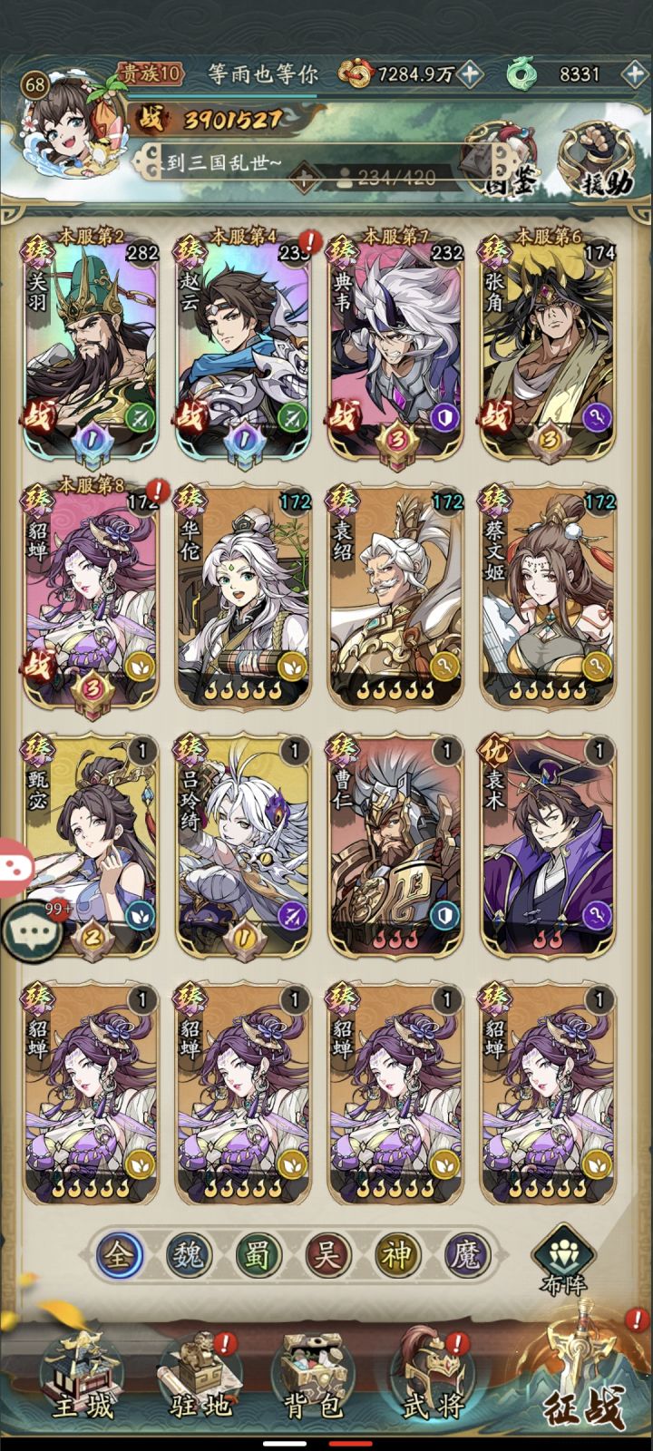 这游戏锁卡池基本是人尽皆知的事,这时候我们还想要有一个好的开局,那就只有一个刷初始的办法了,进入游戏过完新手任务,到7级过后用td888跟xz888两个兑换码外加邮箱里的50个碎片一共150个碎片合成,合出自己想要的就继续玩,不想要就下一个区继续不要浪费时间,继续玩之后抽奖抽出的狗粮都可以分解掉获得将魂用来换取神魔武将,现在能换的神魔武将就两个一个貂蝉一个吕玲绮,优先换貂蝉,貂蝉大招能复活,而且一