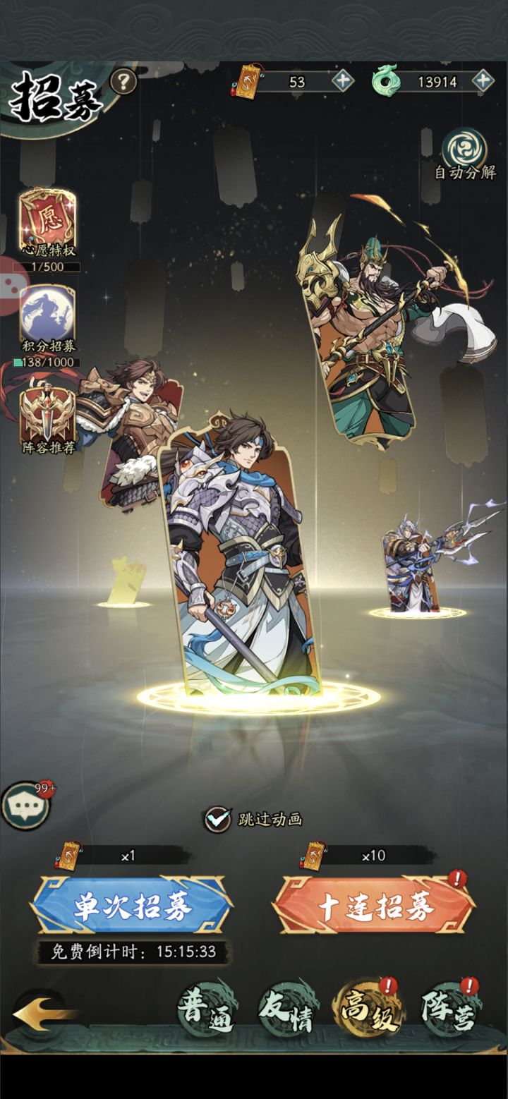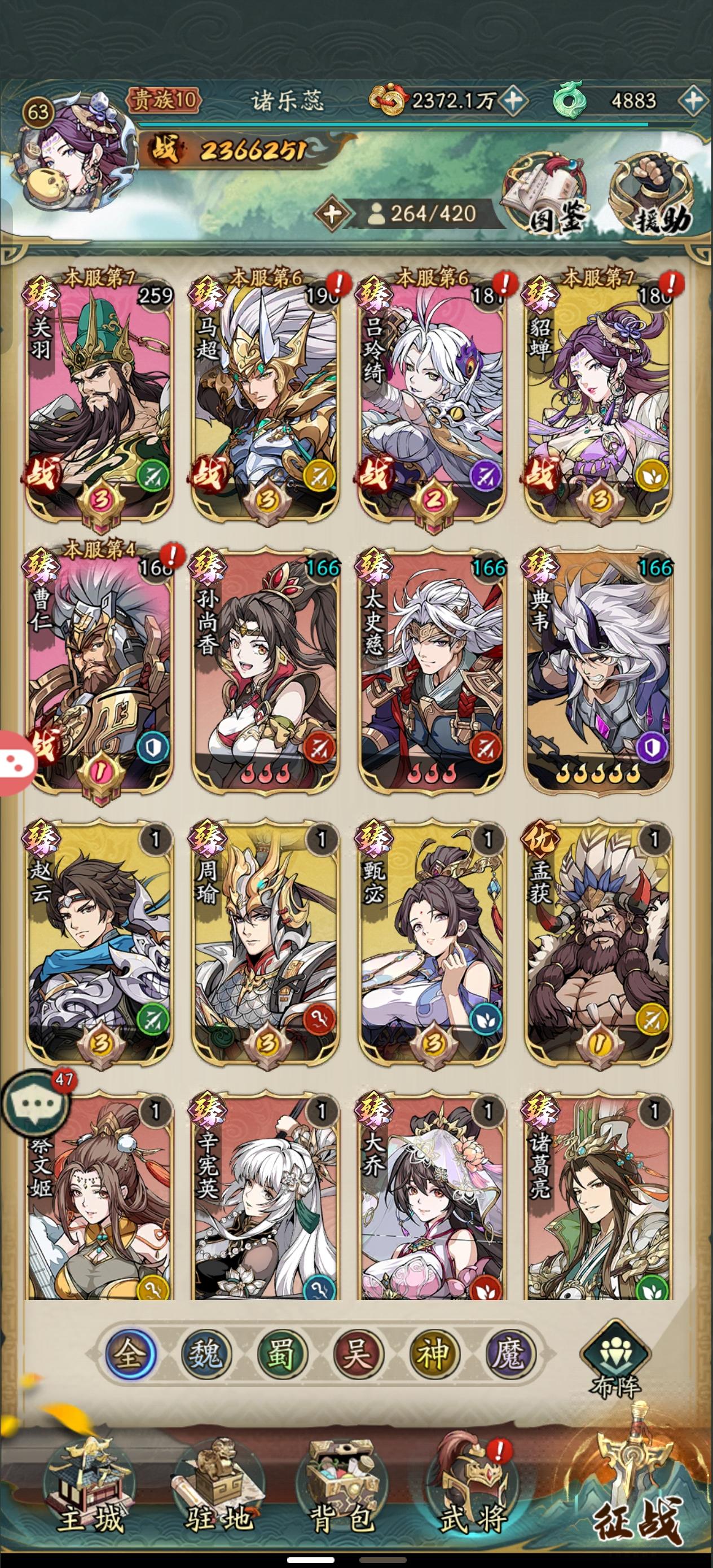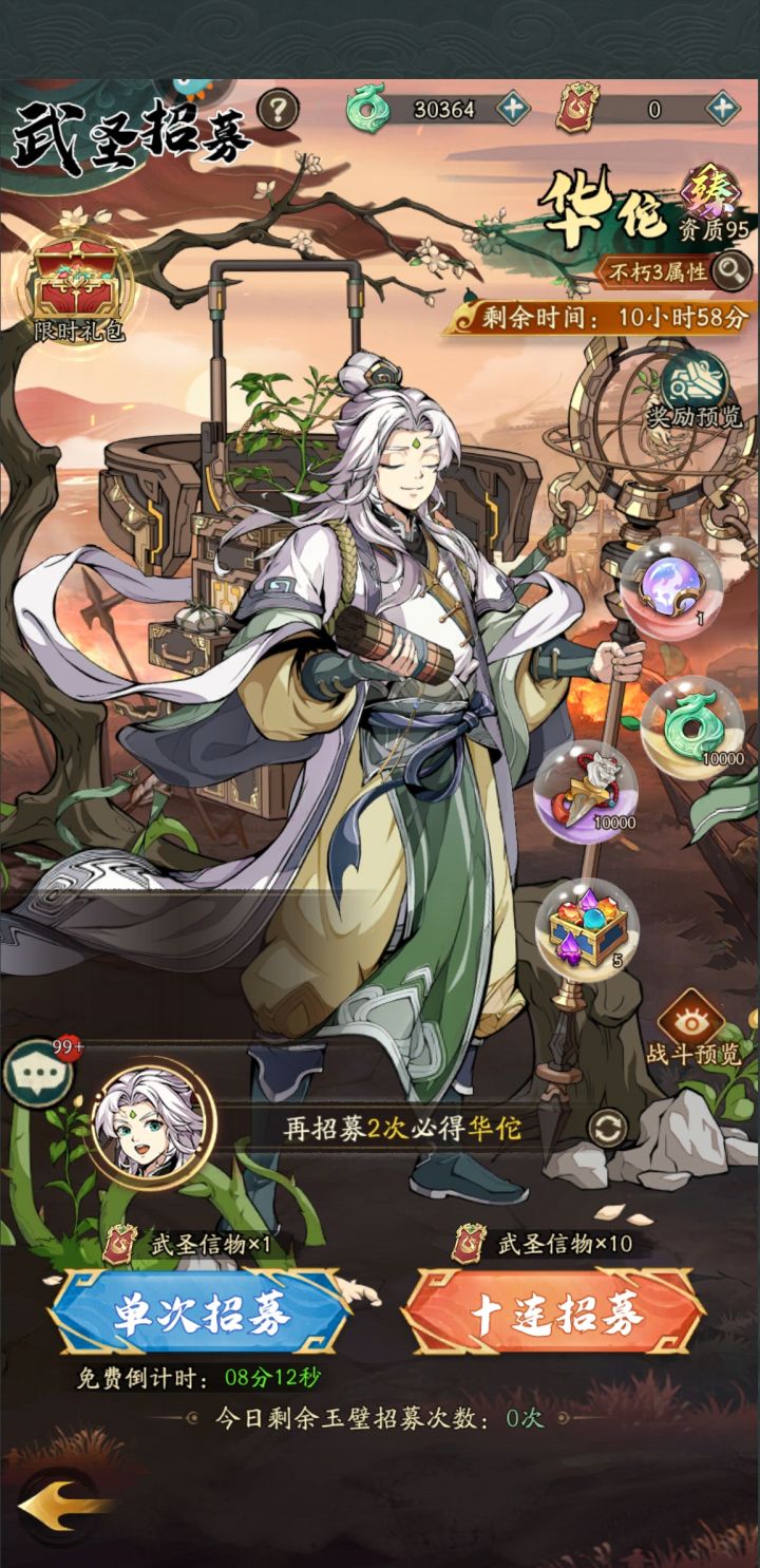 这游戏锁卡池基本是人尽皆知的事,这时候我们还想要有一个好的开局,那就只有一个刷初始的办法了,进入游戏过完新手任务,到7级过后用td888跟xz888两个兑换码外加邮箱里的50个碎片一共150个碎片合成,合出自己想要的就继续玩,不想要就下一个区继续不要浪费时间,继续玩之后抽奖抽出的狗粮都可以分解掉获得将魂用来换取神魔武将,现在能换的神魔武将就两个一个貂蝉一个吕玲绮,优先换貂蝉,貂蝉大招能复活,而且一