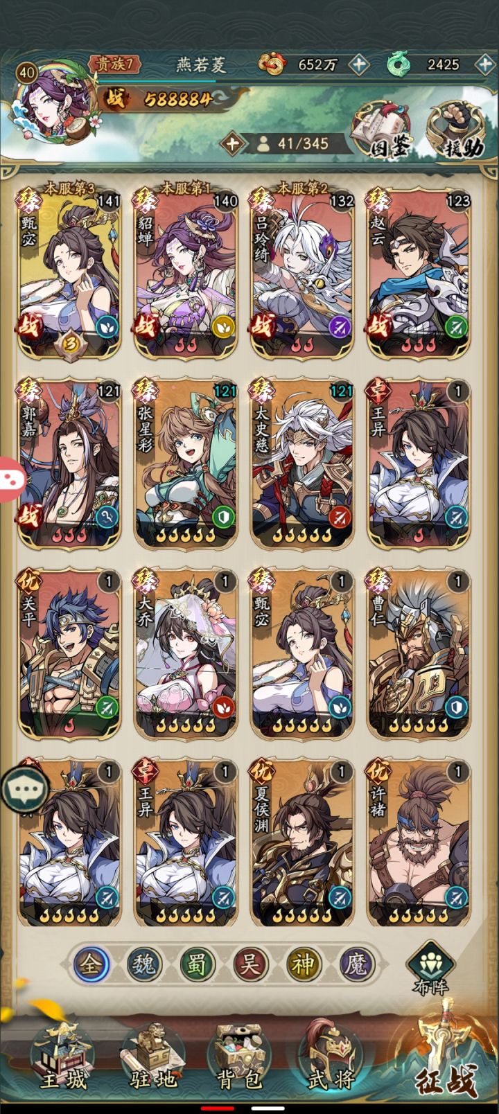 首先开局,兑换码有2个888可以换100个碎片,这个有几率出好货,可以刷一下,出了神魔或者,关羽,郭嘉,孙尚香,其中一个就可以开局了。前面本体比较难,所以可以用小乔,黄月英,甄宓这三张卡,第一天有这三张基本能拿的奖励都可以拿了,其他有啥用啥。好友很重要,加些战力高的,借英雄,第一天过试炼一百层,问题不大。3个阵营都有主队,前期转换的资源可以留一留,看看,先出那个本体多,再全部堆资源就行,就是