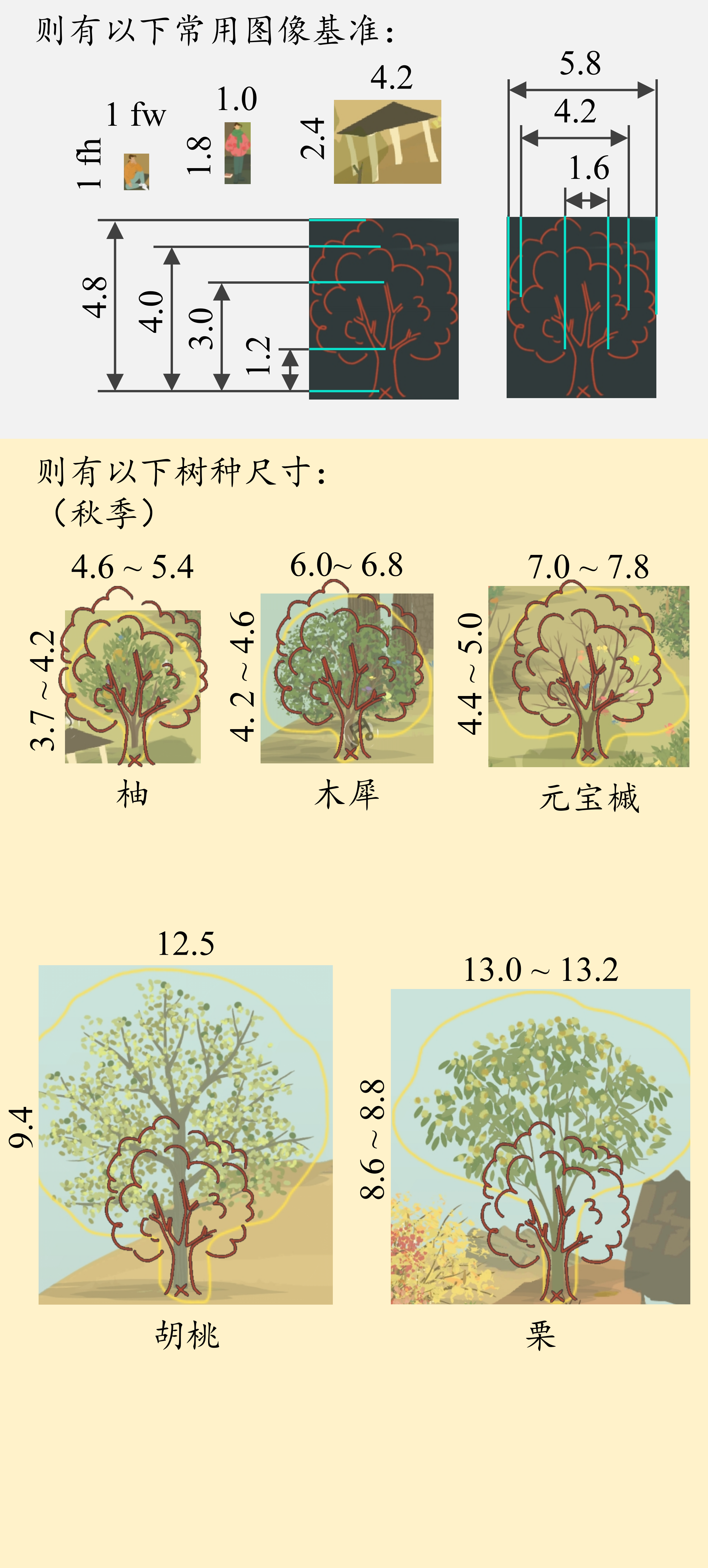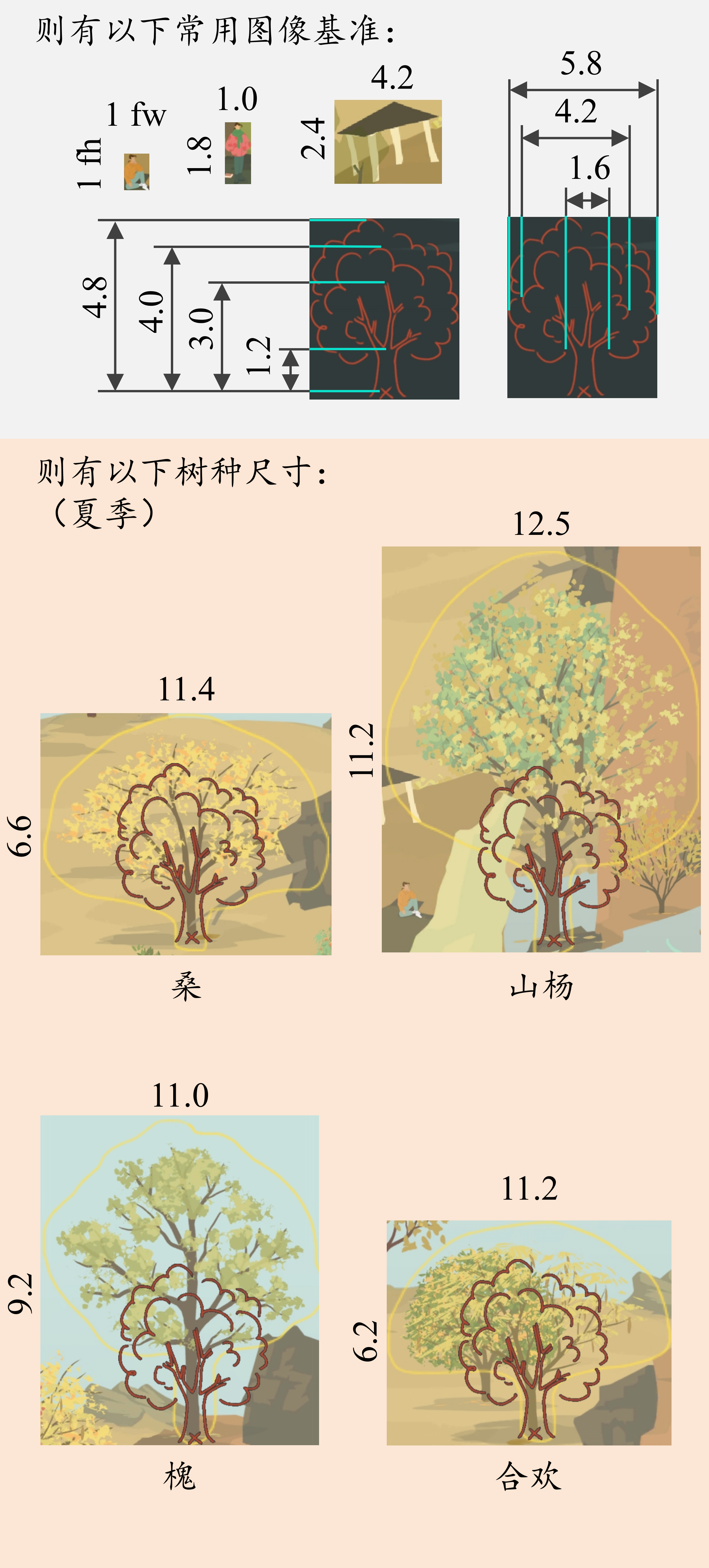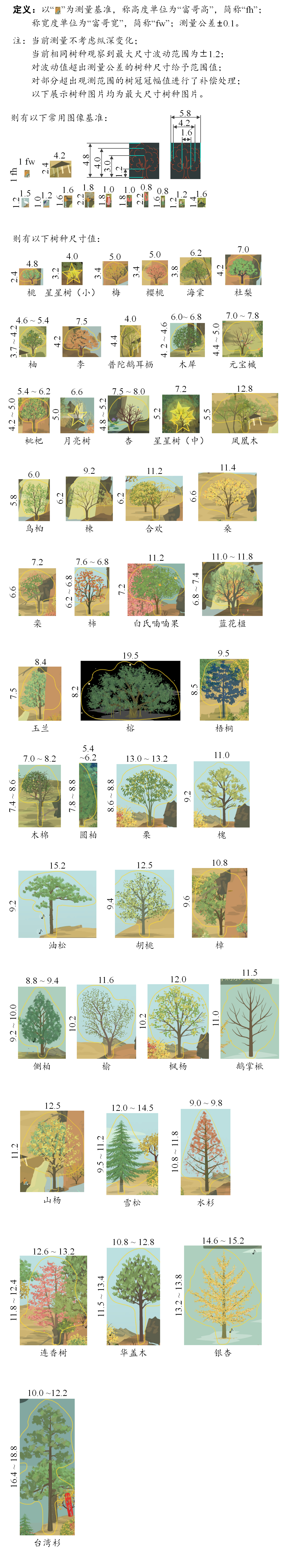 作为一个树种不多,但又想把山头排布好看一点的新手,翻阅诸多帖子后依然对各树种高度、冠幅没有直观理解。于是乎,是时候启用一些邪修手段了!(正经脸)本文以闲坐版富哥为测量基准,研究本人所有树种的尺寸值。通过闲坐版富哥定义了高度单位与宽度单位,并测量了各树种的高度、冠幅,获得了树种相对尺寸参数;通过设定常用图像基准(富哥、山亭、树影等),给予了山友们更直观的树种尺寸认识。本文建立了树种通用测量标准,