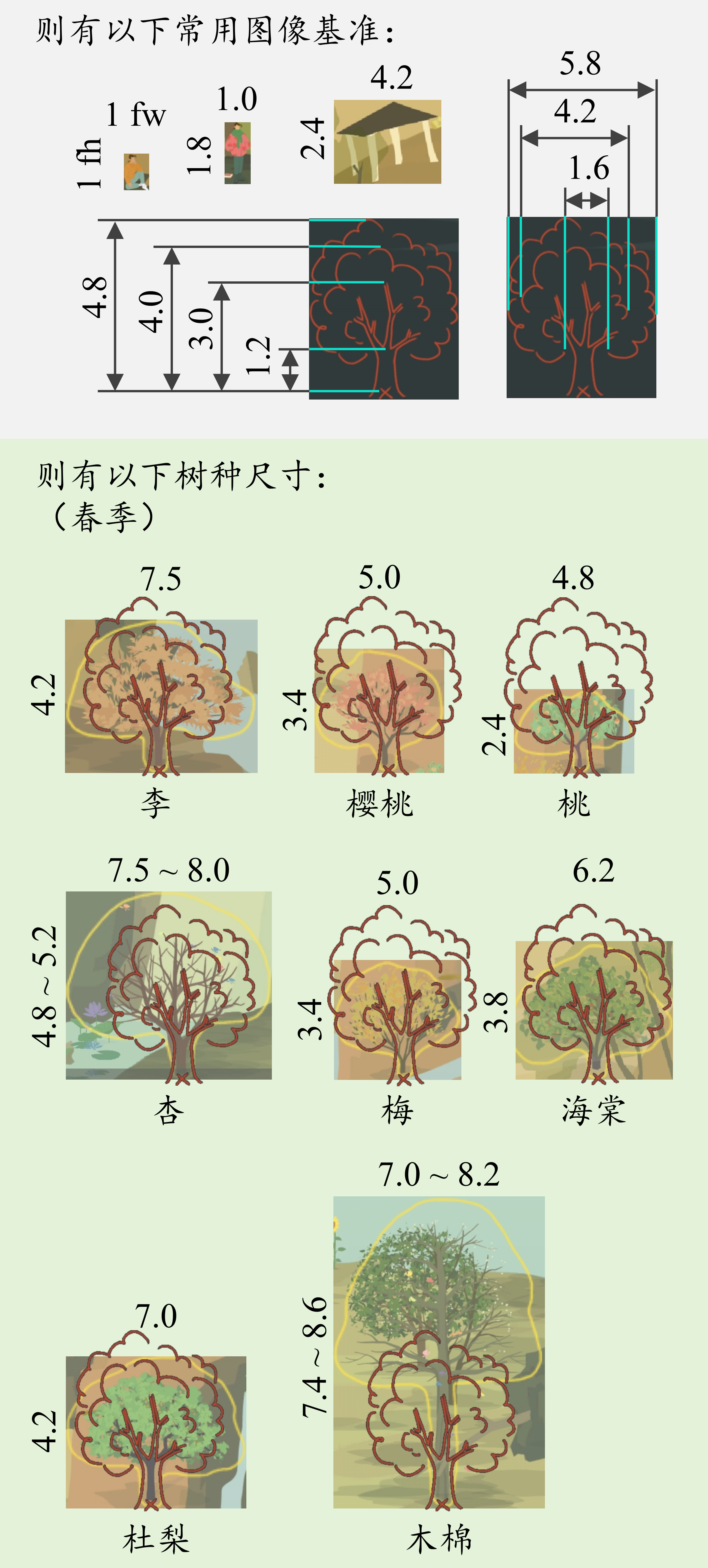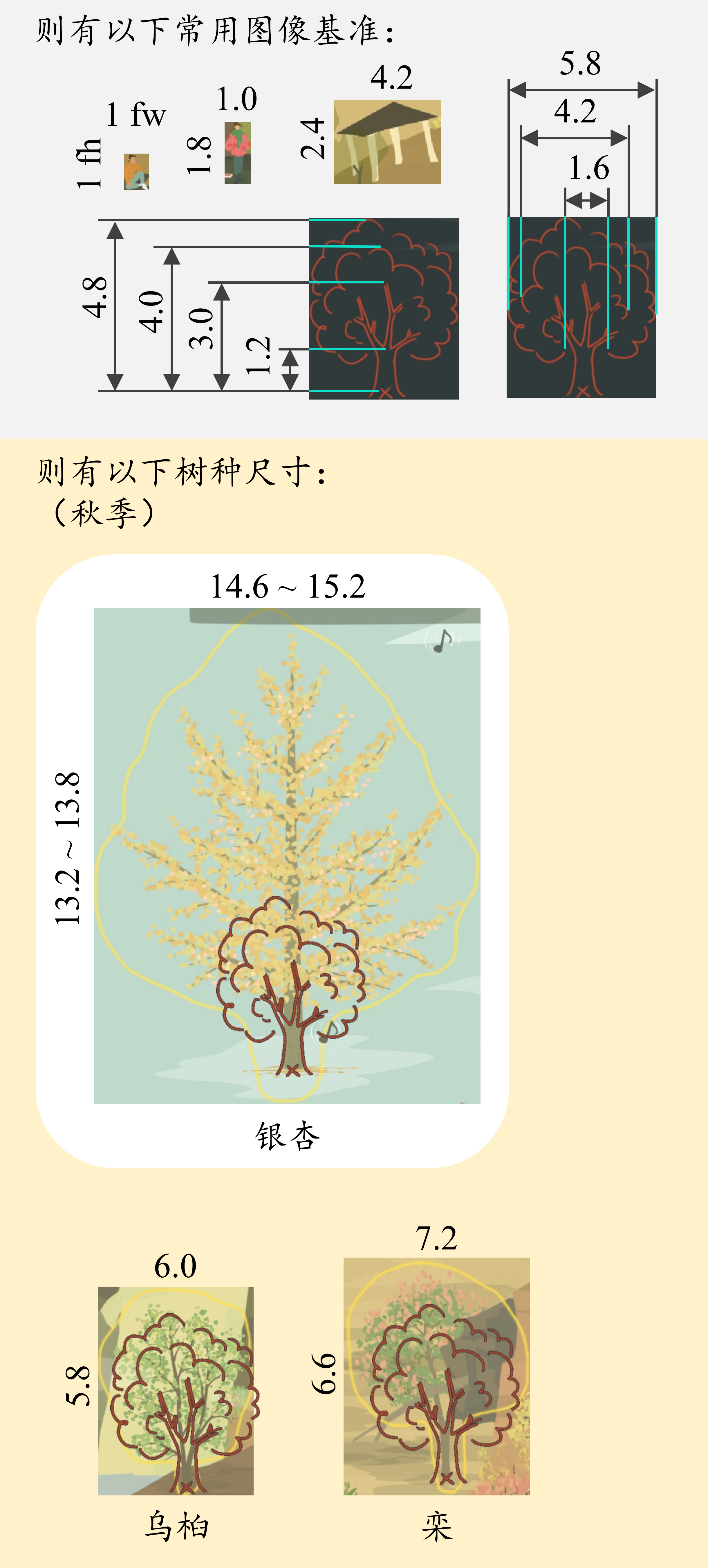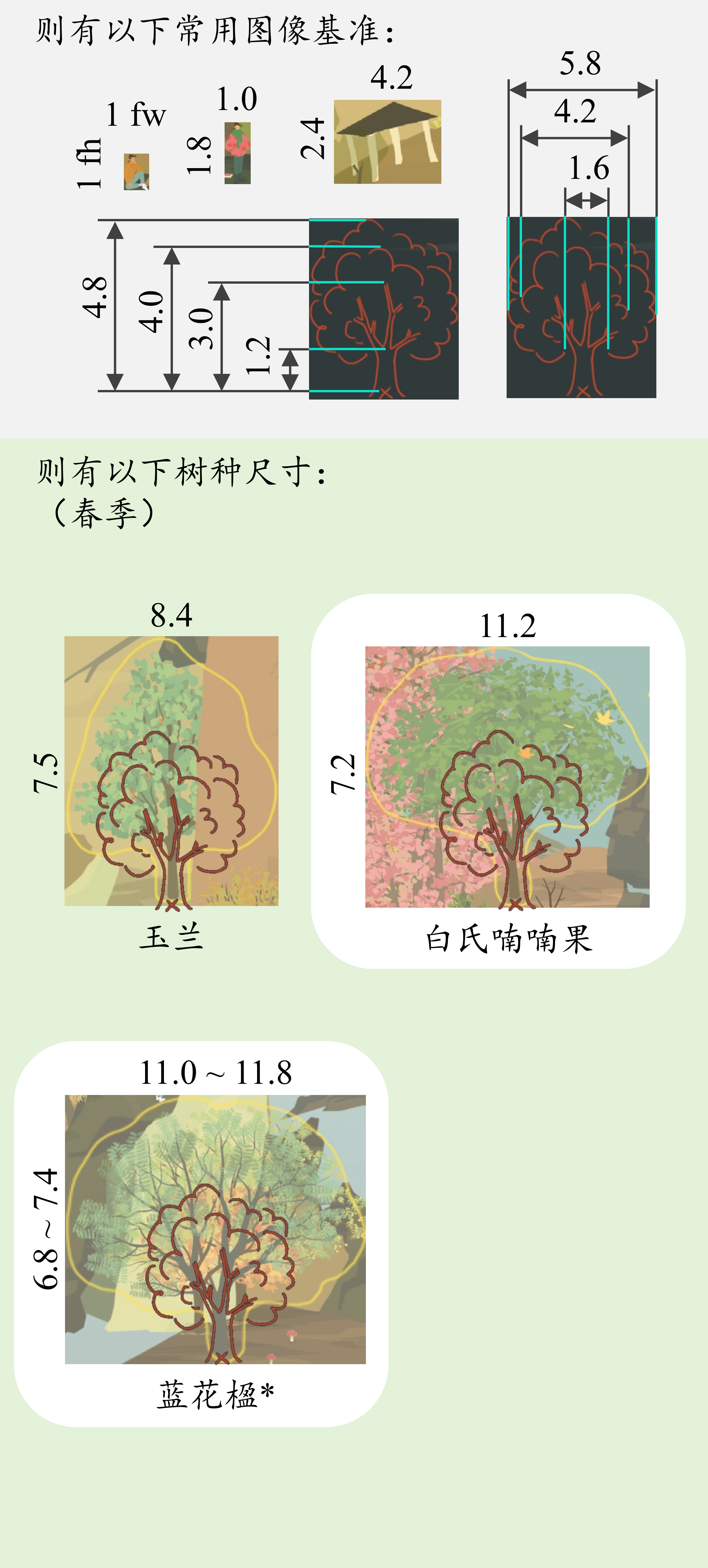 作为一个树种不多,但又想把山头排布好看一点的新手,翻阅诸多帖子后依然对各树种高度、冠幅没有直观理解。于是乎,是时候启用一些邪修手段了!(正经脸)本文以闲坐版富哥为测量基准,研究本人所有树种的尺寸值。通过闲坐版富哥定义了高度单位与宽度单位,并测量了各树种的高度、冠幅,获得了树种相对尺寸参数;通过设定常用图像基准(富哥、山亭、树影等),给予了山友们更直观的树种尺寸认识。本文建立了树种通用测量标准,