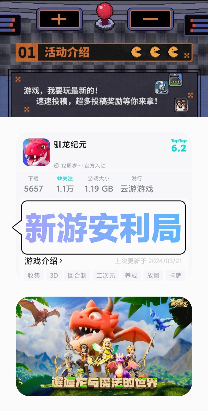 游戏标签🏷【策略】 【收集】 【3D】 【回合制】 【二次元】 【养成】 【放置】 【卡牌】🐲《驯龙纪元》是一款卡通画风的3D放置多人联机休闲手游。游戏背景为架空泰瑞尼亚世界,这个世界由多个风貌迥异的大陆组成。人类、精灵以及其他众多智慧种族在这里共同生活。🐲玩家将扮演冒险者,在四位主人公的引领下踏上冒险旅程。🐲游戏安装包1.19GB,可能是因为3D画面,对内存有一定要求。内设挂机奖励