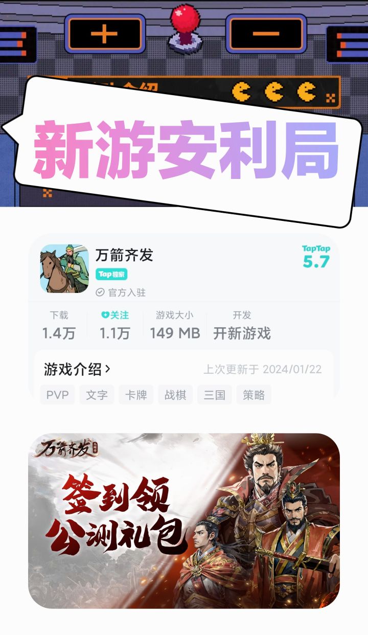 游戏标签🏷【PVP】 【文字】 【卡牌】 【战棋】 【三国】 【策略】✨《万箭齐发》是一款比较简略的卡牌战棋手游,游戏安装包149MB,目前已🈶1W下载✨游戏中,玩家可以获得各类历史名将角色卡牌,每张卡牌都有自己独属的技能和效果,使用自己的卡牌去击败敌方将领,最终取得胜利。✨卡牌技能原型不少都是耳熟能详的历史典故,例如诸葛亮的舌战群儒、周瑜的火烧赤壁等等…#游戏种草计划#三国#策略手游#卡牌游戏