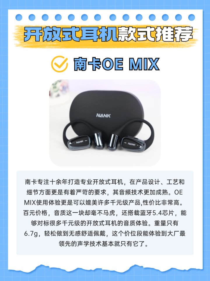 好物合集/耳机测评分享/好用的开放式耳机/耳机合集 小白在入手开放式耳机之前还是要做好功课再入手,不然买回来很容易踩雷的, 作为一个经常使用开放式耳机的大户,来来回回已经换过不少耳机了, 也不希望大家在这上面浪费钱,我总结了几款,有需要的可以抄抄作业! 📍#南卡OE MIX 音质: 其实开放式耳机的音质跟入耳式的耳机还是会有点差距的, 但是其实我感觉南卡这款的音质是不错的, 音场很宽阔,没