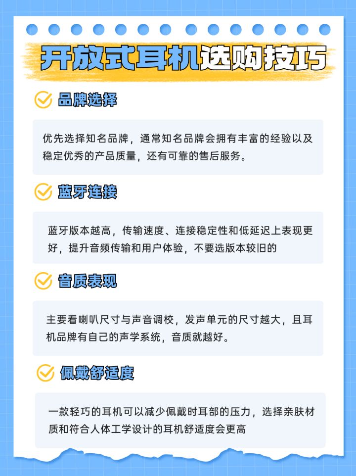 铁子们!开放式耳机真的不能乱用踩雷了不仅有杂音不说,严重点还会伤耳!!所以入手开放式耳机之前一定要认认真真做功课这样才不会踩雷总结了几款好用的开放式耳机分享给大家,让大家做个参考啦~开放式耳机选购需要重点留意以下几个点:⭕品牌选择(优先实力大品牌)⭕音质体验(听歌好吗?)⭕佩戴舒适度(长时间戴耳朵会难受吗?)⭕耐用性(耳机用得久吗?)⭕蓝牙连接(选择更高版本蓝牙的耳机)上图我