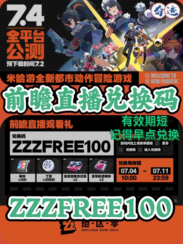 前瞻直播兑换码:12号过期早点换哦ZZZFREE100登录及体验一共可领:🌟1600菲林➕90抽角色卷➕80邦布卷➕A级角色🔶登录:30抽常驻卷➕5抽邦布➕A级角色🔶签到: ⚠️注意时间【一期:7.4-8.13】10抽up卷【二期:7.11-8.13】10抽up卷【三期:7.24-8.13】10抽邦布卷🔶等级:5: 10抽普池➕10抽邦布卷15: 10抽普池➕10抽邦布卷2