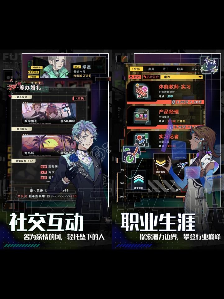 🎮名字:未来人生✅平台:TapTap🏷标签:模拟人生、科幻、角色扮演------👉一款文字模拟人生游戏,在游戏里多周目体验各类人生,达成不同结局。·👉人生三部曲的最后一部,在前两部《古代人生》《当代人生》的基础上增加了更多游戏内容。·✨未来人生发生在2050年,在霓虹背景下体验未来世界,不同的职业、不同的时间等等。✨推出全新的社交模式,增加网络空间,虚拟和现实交互。------