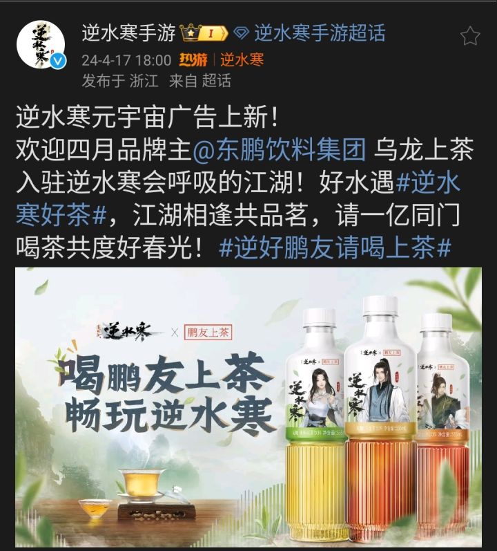 各位江湖逆友们,《逆水寒》的跨界联动他又来了,这次是与东鹏饮料合作推出“乌龙上茶”联名版饮品。“乌龙上茶”是东鹏饮料在去年推出的无糖茶饮品。官方介绍,该饮品采用上好的特级水仙茶叶,经高温短时原叶萃取,致力于还原纯正现泡茶风味,茶汤岩韵醇香,天然又健康。《逆水寒》作为一款网易推出的古风武侠网游,一直以来都有着丰富的文化底蕴和精致的游戏画面,坐拥大量的玩家。这次《逆水寒》与“乌龙上茶”的联名,可以