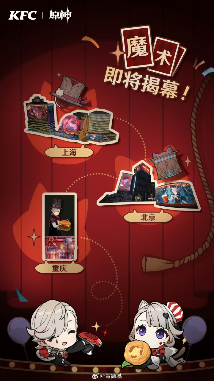 #今天游戏圈发生了啥 夜幕四合,剧场外灯牌闪烁,预示着一场好戏即将上演...旅行者,这个夏天好戏连连,快带上演出“门票”,加入这场盛大魔术秀吧!✨特别彩蛋:7月12日-7月25日,旅行者前往肯德基APP,进入到店自取点餐搜索栏内输入“神秘暗号”,可以触发惊喜魔术特效哦!大魔术师空降三城大屏,魔术秀奇迹登场!🪄特别情报:北京、上海、重庆大屏现场将有Coser出席,旅行者有机会捕捉Coser