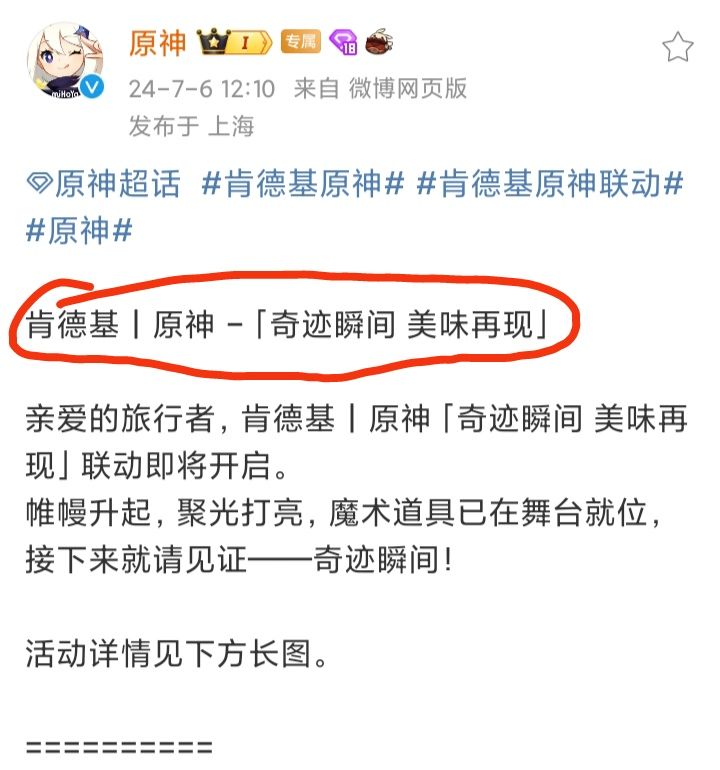 7/6号中午,《原神》官博发文称:将联动肯德基,开启「奇迹瞬间 美味在线」联动活动❗❗❗联动期间,肯德基会有联动新品上线,同时有线下大屏活动、快闪活动等该联动活动,几天前就曾被内鬼提前爆出,但似乎并没有任何影响现在的原神联动,再也没有“异世相遇,尽享美味”的社死口号了,没那味了不知道大
