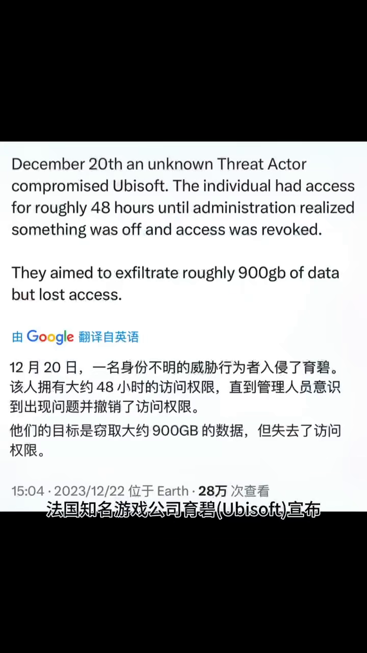 育碧(Ubisoft)再次遭遇黑客攻击。 近日,法国知名游戏公司育碧(Ubisoft)宣布他们正在调查一起数据安全事件。 VX-Underground发文表示,12月20日,该公司遭到一名身份不明的黑客攻击,该黑客获得了育碧内部系统的访问权限,持续时间约为48小时。黑客试图提取约 900 GB 的数据,但在此之前就失去了访问权限。 随后,安全研究机构VX-Underground公开了一些与育碧内部