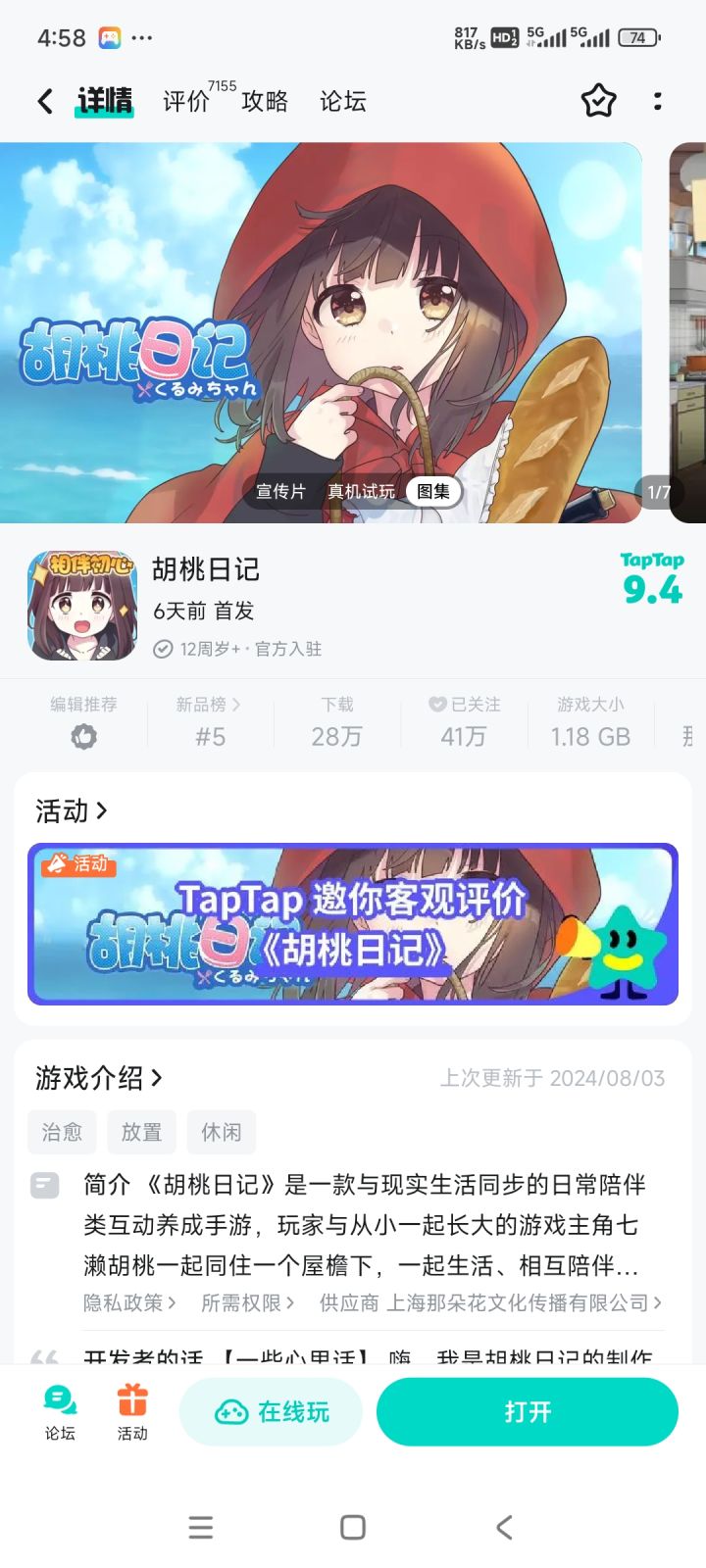 安利《胡桃日记》,温馨治愈之旅等你启航!胡桃以无敌可爱捕获你心,走进她的生活,共度日常。《胡桃日记》画风清新,色彩温暖,胡桃萌态可掬,场景细腻生活感十足。多样互动,对话戳头,送礼升温,但互动需适度哦!完成任务得奖励,为胡桃换装,美丽升级。高度互动养成,乐趣无穷,满足感爆棚。快来胡桃世界,共度美好,创造难忘回忆!温馨之旅,不容错过! #我的游戏日记vol12 #胡桃日记 #放置游戏 #治愈 #治愈系